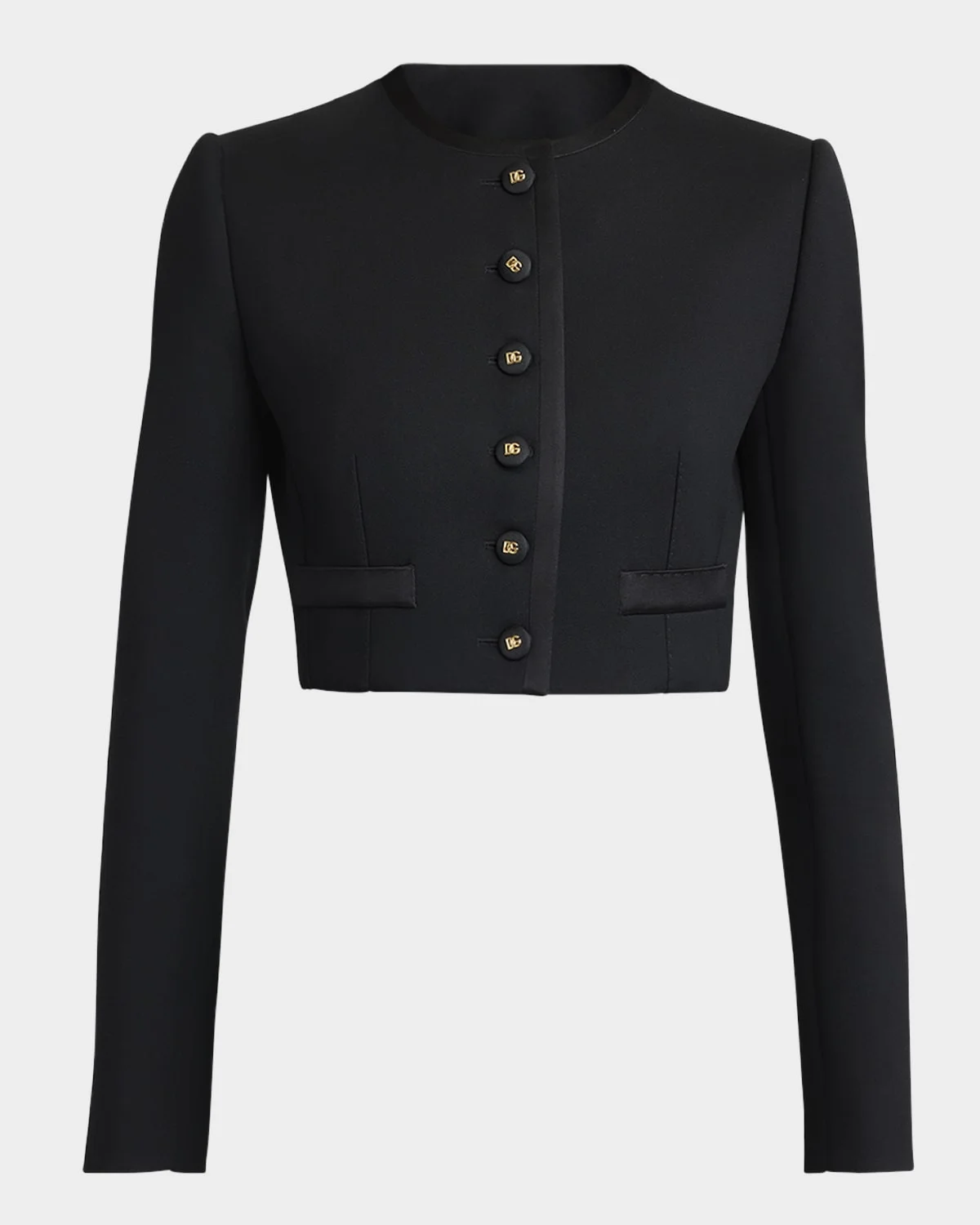 Dolce & amp;Gabbana "Lana" double face stretch collarless jacket featuring DG buttons, padded shoulders, and satin trim Round neckline; single-breasted front Long sleeves; button cuffs Side welt pockets Slim fit Cropped length Virgin wool/silk/polyester Made in Italy