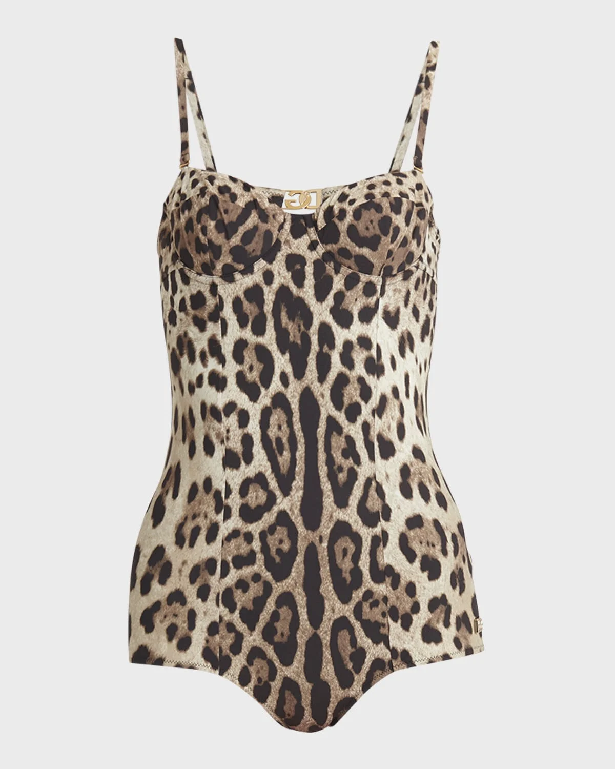 Dolceamp;Gabbana balconette onepiece swimsuit in an allover leopard print Sweetheart neckline Removable adjustable straps Structured cups with underwire support Midback DG clasps Back keyhole cutout Full seat coverage Nylon/polyamide/elastane Made in Italy