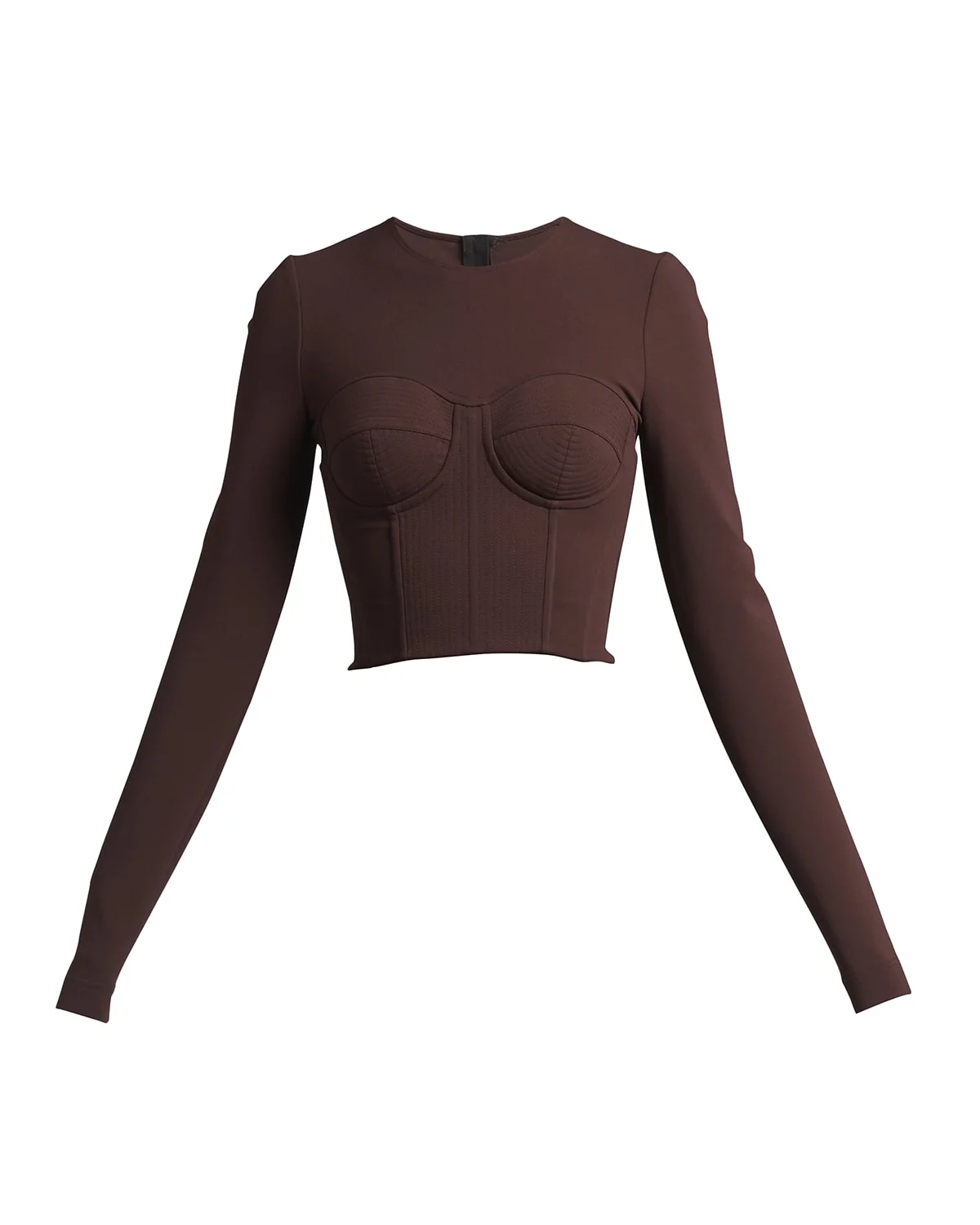 Dolce & amp;Gabbana bustier & nbsp;top with inner corsetry structure Crew neckline; concealed back zip Long sleeves Fitted Cropped length Rayon/nylon/spandex Silk, lining Made in Italy Model is 5 & apos;10"/177cm.