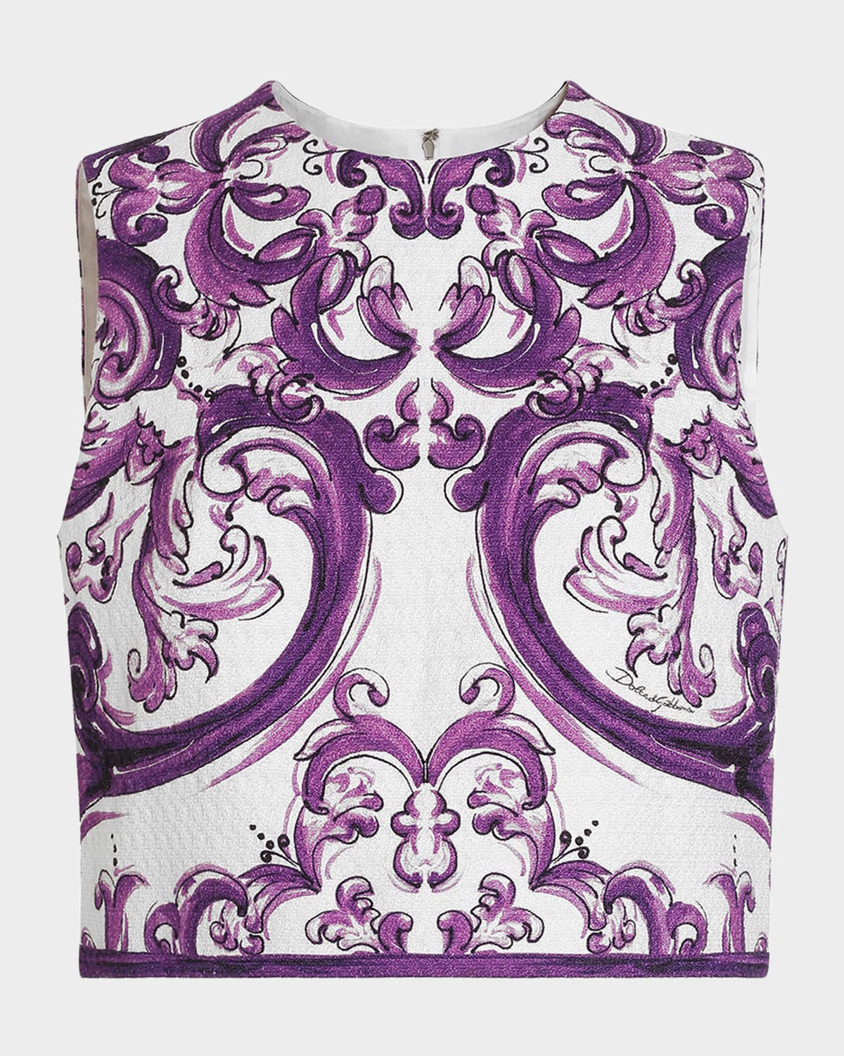 - Dolce&Gabbana tank top with Majolica print - Crew neckline - Sleeveless - Boxy fit - Cropped length - Back zip - Cotton/rayon/cellulose acetate/linen - Made in Italy