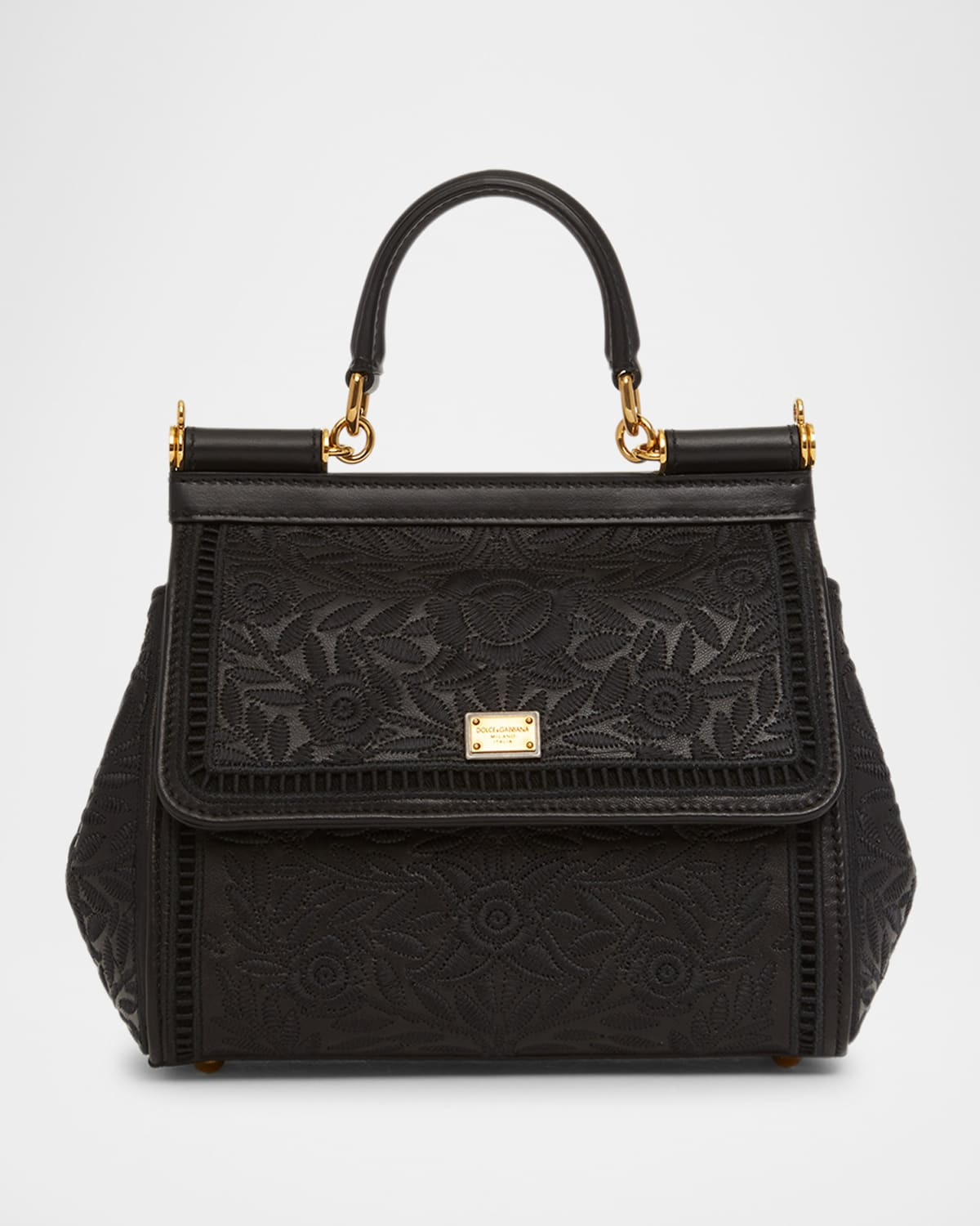 - Dolce&Gabbana "Sicily" top handle bag in embroidered leather and polyester - Top handle - Detachable, adjustable crossbody strap - Can be worn as a top handle or crossbody bag - Flap top with magnetic closure - Interior, one card slot - Feet protect bottom of bag - Approx. 7"H x 8"W x 4"D - Made in Italy
