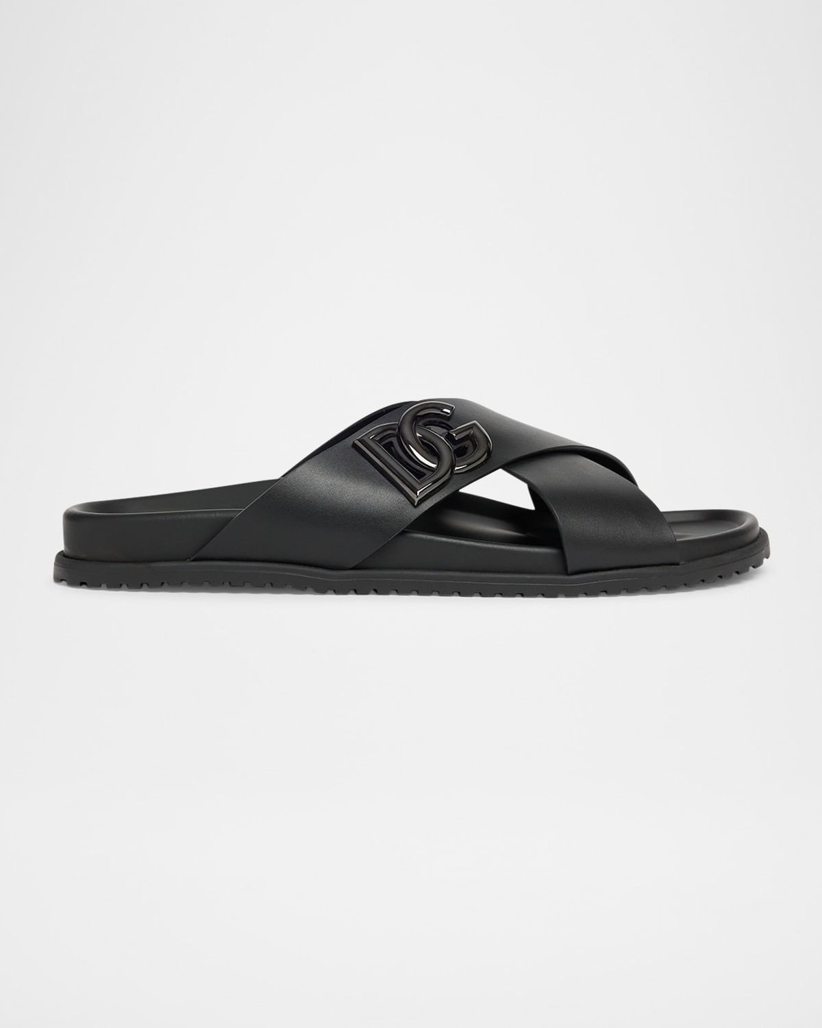 - Dolce&Gabbana smooth calfskin sandals - Features interlocking 3D metal logo - Crisscross straps - Cushioned footbed - Leather sole - Slide style - Made in Italy - Includes branded dust bag