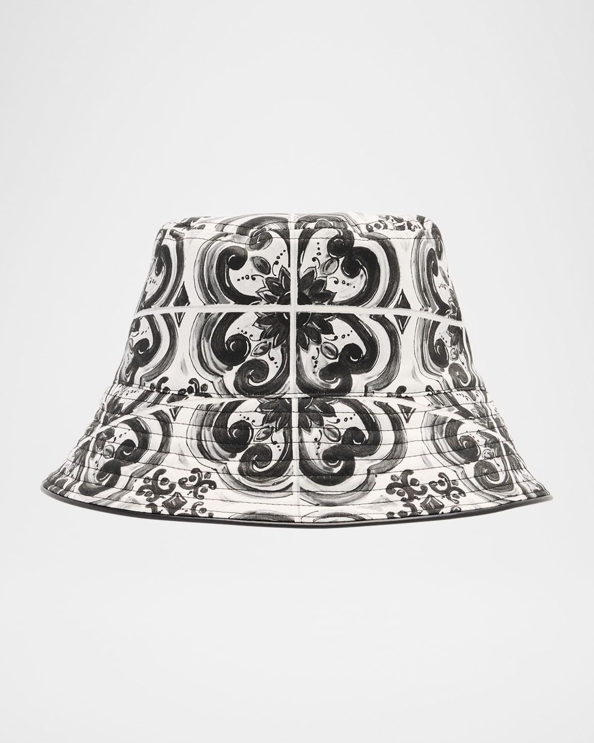- Dolce&Gabbana bucket hat in signature Majolica print - Flat crown - Downturn brim - Cotton/spandex/polyester - Made in Italy