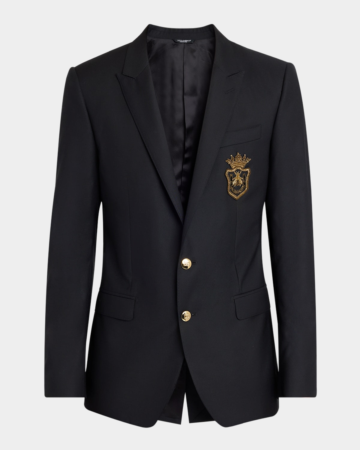 - Dolce&Gabbana blazer with embroidered emblem at chest - Peak lapels - Two-button closure - Chest welt pocket - Hip flap pockets - Inner welt pockets with button - Martini fit - Four-button sleeve finish - Center back vent - Virgin wool/silk - Lining: Rayon - Made in Italy