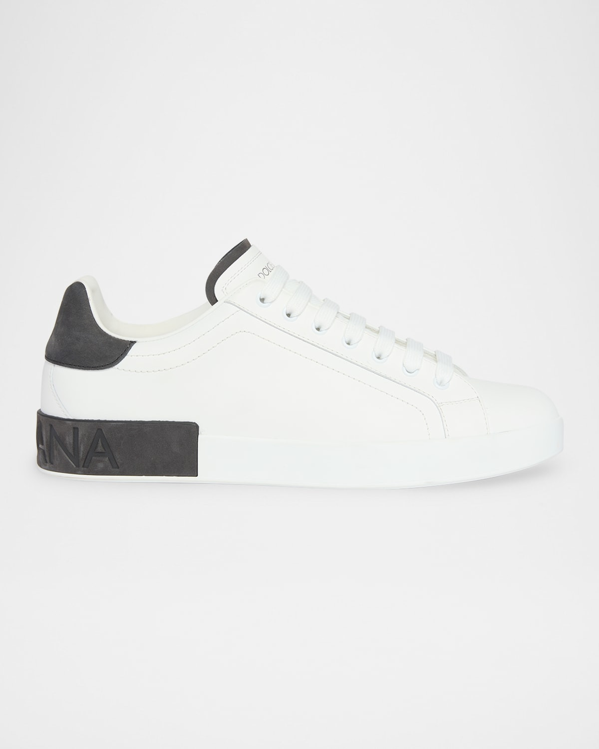 - Dolce&Gabbana "Portofino" low-top sneakers in calfskin - Flat heel - Round toe - Lace-up vamp with flat laces - Tongue with embossed logo - Calfskin footbed with branded label - Contrasting suede calfskin heel cup - Lining: Goat leather - Branded rubber sole - Made in Italy - Includes a branded dust bag