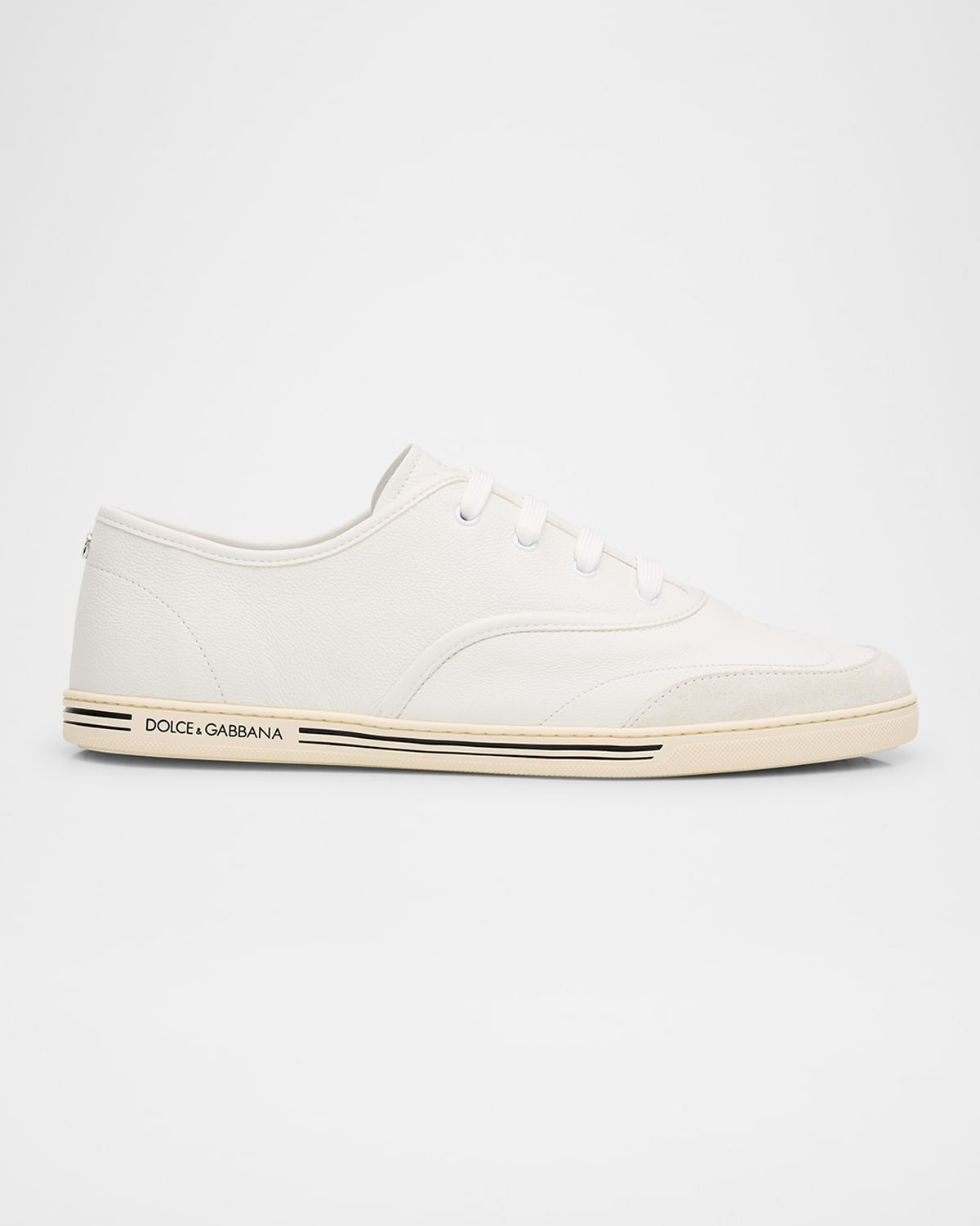The "Saint Tropez" sneakers by Gabbana are crafted from grained calfskin, creating the perfect fusion of casual style and refined accents Fall/Winter 2025 Fashion Show Collection Flat heel Round Ttoe Laceup vamp Branded tongue Contrast shoelaces Felt insole Polyurethane fussbett insole, leatherwrapped with label DG heel accessory Midsole logo with stripes TPU outsole Spot clean Made in Italy