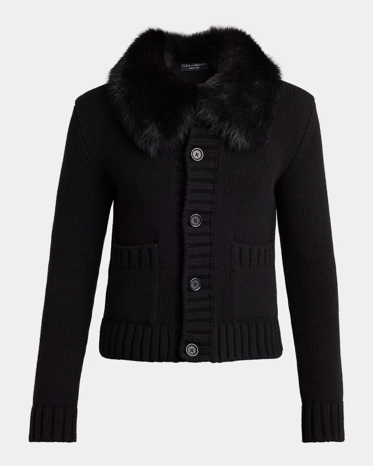 Dolceamp;Gabbana jacket combines comfort and elegance with a dyed shearling (Italy) collar Spread collar Button placket Long sleeves Two front patch pockets Ribbed cuffs and hem Virgin wool Made in Italy