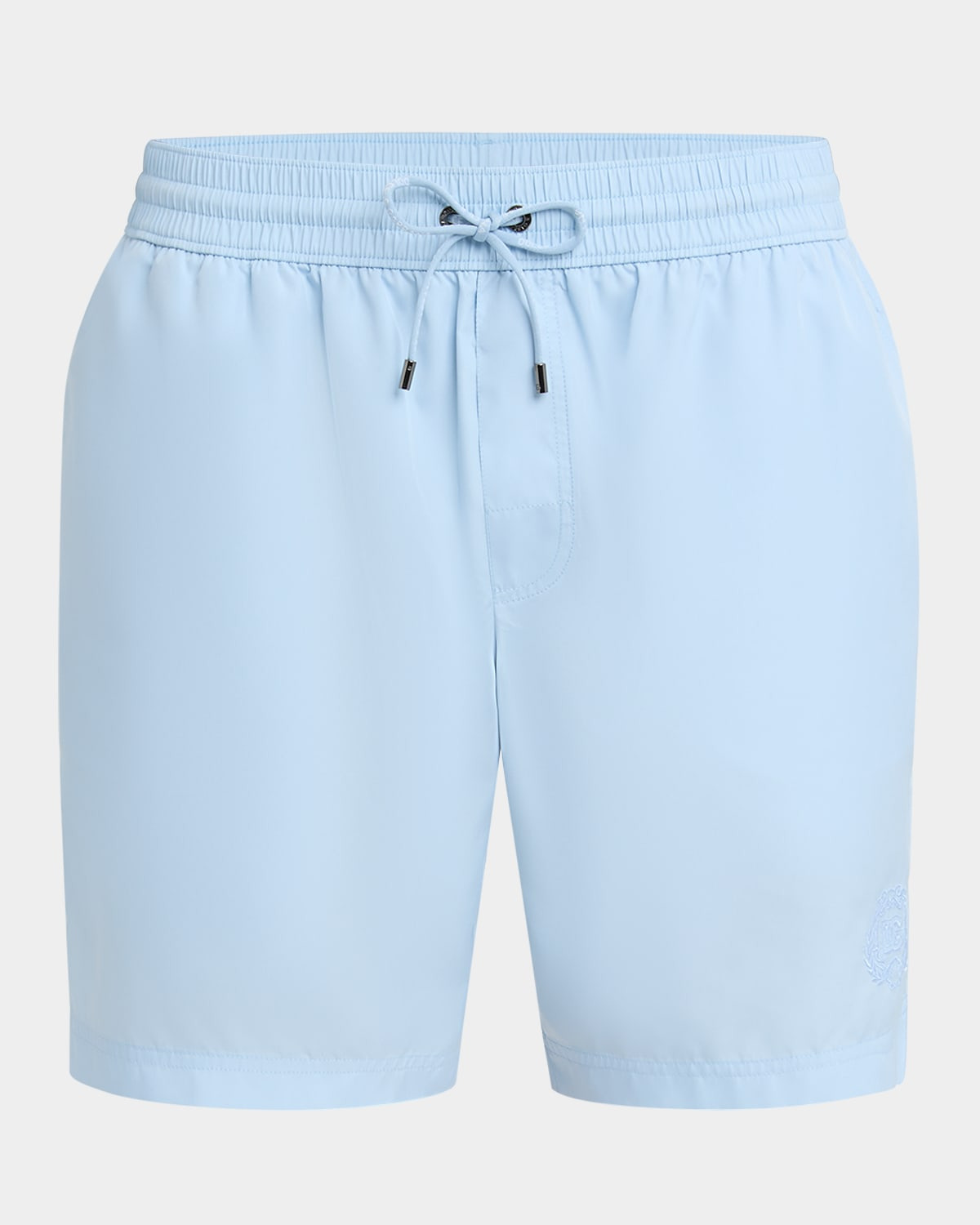 - Dolce&Gabbana solid swim bottoms defined by a tonal embroidered emblem on the left leg for understated branding - Regular rise - Side on-seam pockets - Branded back zip pocket - Elasticized drawstring waistband - Mid-length - Relaxed fit - Pull-on style - Polyester - Lining: Nylon/spandex - Made in Italy