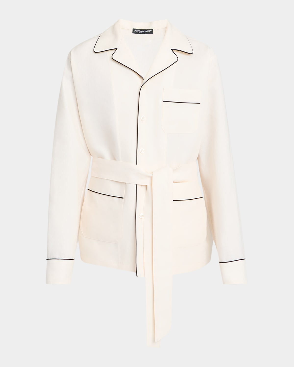 - Dolce&Gabbana "Vanity" pajama top with piping details - Notched collar - Button front closure - Chest and hip patch pockets - Self-tie sash at waist - Long sleeves - Linen/silk - Hand wash or dry clean - Made in Italy