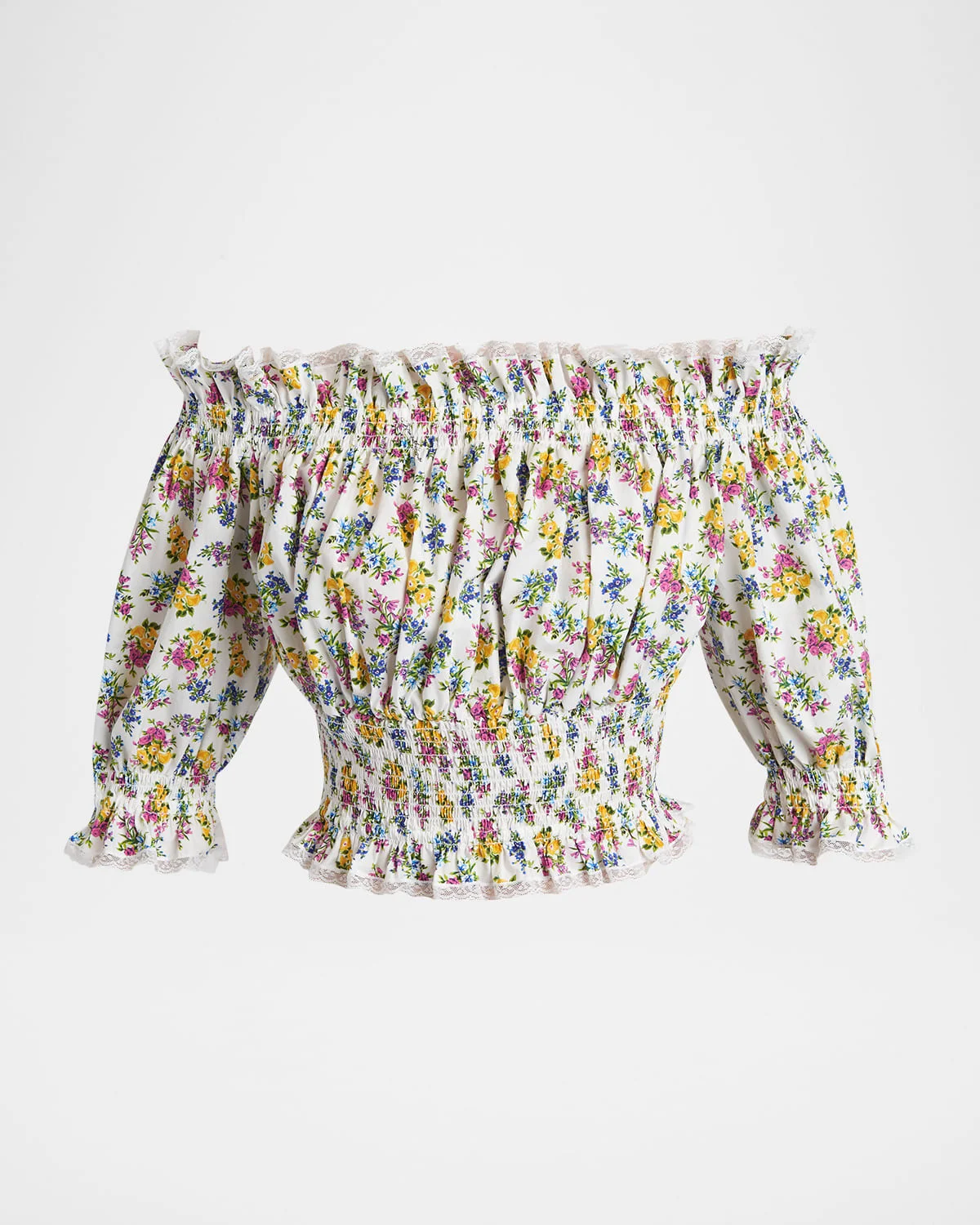 Dolce & amp;Gabbana crop top decorated with an artful floral print and delicate lace trim. Off-the-shoulder neckline Three-quarter & nbsp;sleeves Smocked waist Cropped length Pullover style Cotton/nylon/polyamide Made in Italy