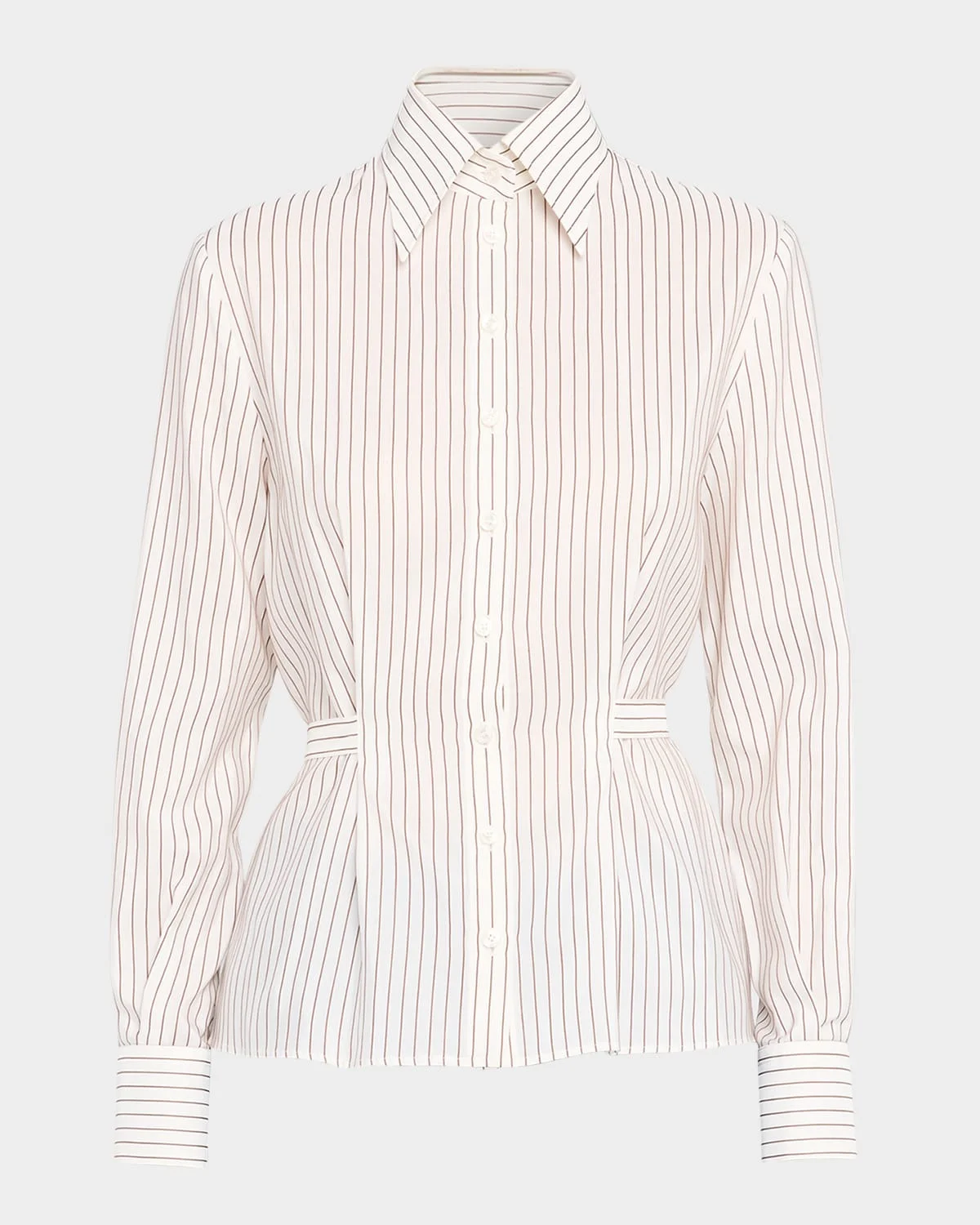 - The timeless elegance of this Dolce&Gabbana shirt is elevated with figure-lengthening pinstripes and a cinched waist - Point collar - Button front closure - Long sleeves - Buttoned bevel cuffs - Lower back self-tie - Tailored fit - Cotton/silk - Made in Italy