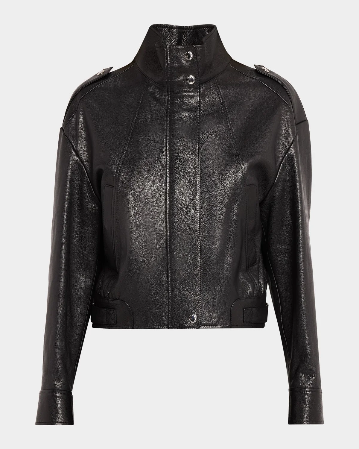 Crafted from plonge goat leather, this moto jacket from Dolce & amp;Gabbana features shoulder epaulets and a logo-engraved metal tab on the back Stand collar; snap-concealed zip front Long sleeves; snap cuffs Drop shoulders Hip welt pockets Straight fit Hip length Snap-tab cuffs Leather Made in Italy SIZE & FITModel measurements: 5 & apos;10" tallModel is wearing a US size 4/Small