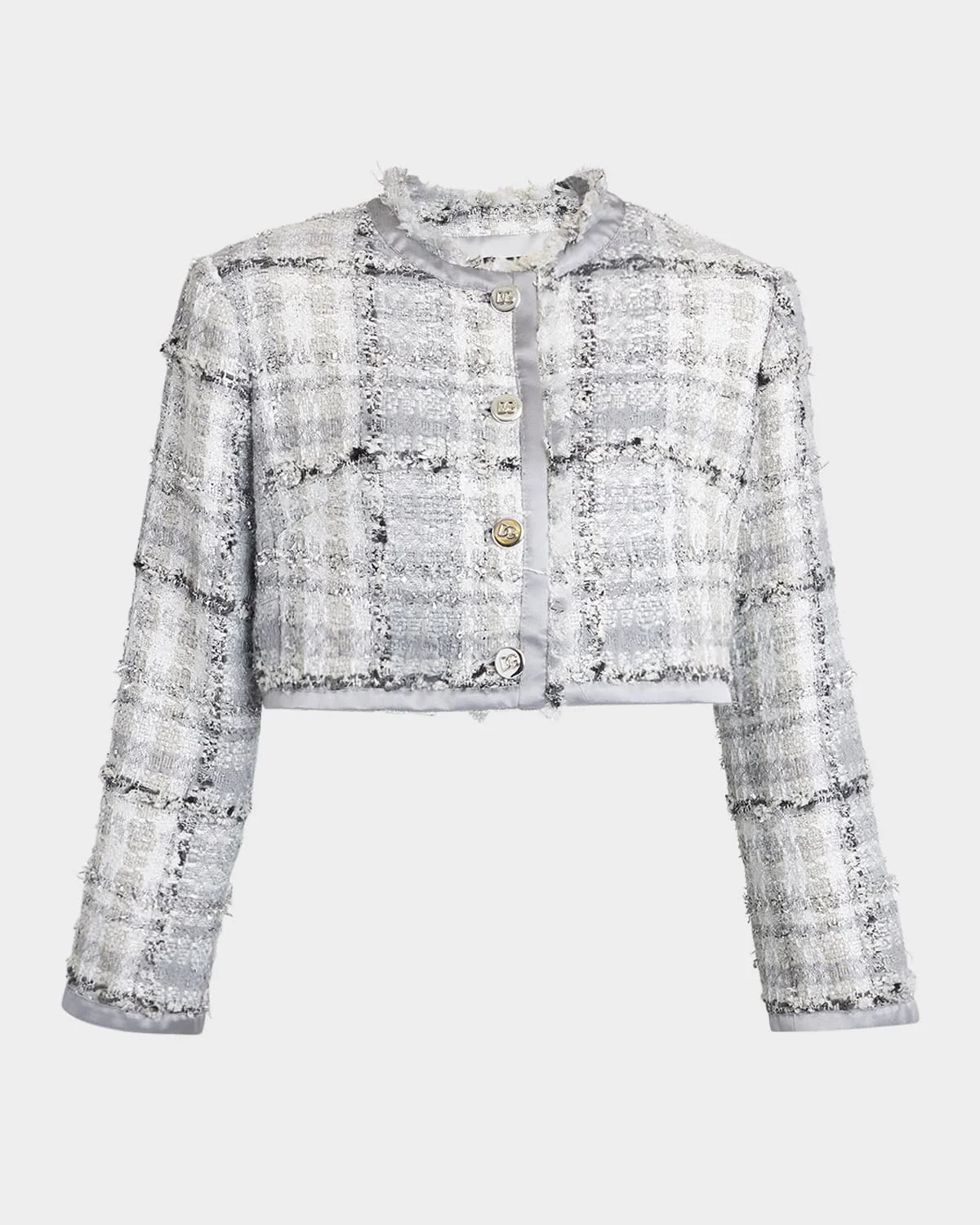 Dolceamp;Gabbana "Rachel" check metallic eyelash tweed jacket with satin trim and DG buttons Round neckline; singlebreasted front Long sleeves Padded shoulders Straight fit Cropped length Rayon/cellulose acetate/wool/nylon/polyamide Made in Italy