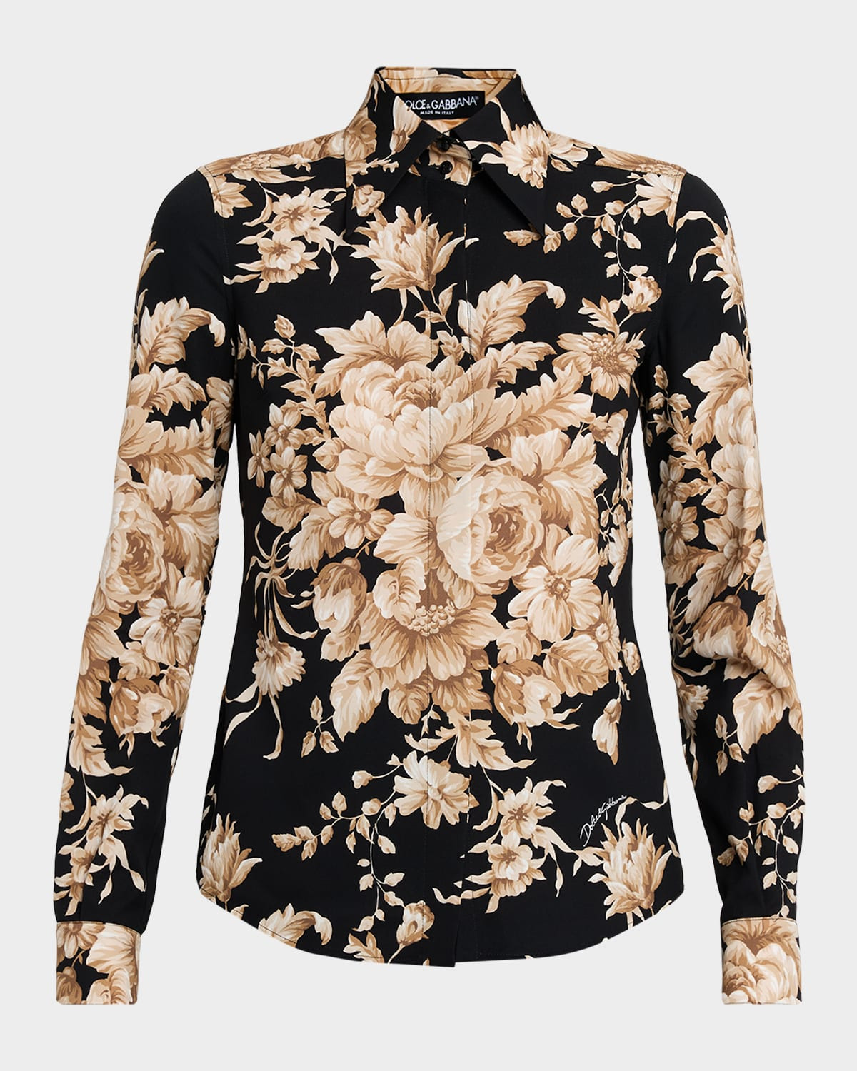 Dolceamp;Gabbana shirt is crafted of roseprinted cretonne charmeuse Point collar; concealed button front Long sleeves; button cuffs Slim fit Shirttail hem Silk/spandex Made in Italy