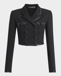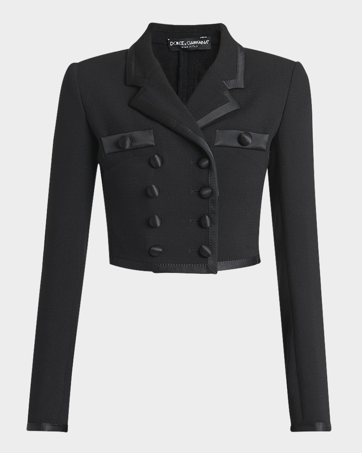 Dolceamp;Gabbana stretch crepe jacket featuring satin trim and covered buttons Notch lapels; doublebreasted front Long sleeves; button cuffs Padded shoulders Chest buttonwelt pockets Slim fit Cropped length Virgin wool/silk/polyester Made in Italy