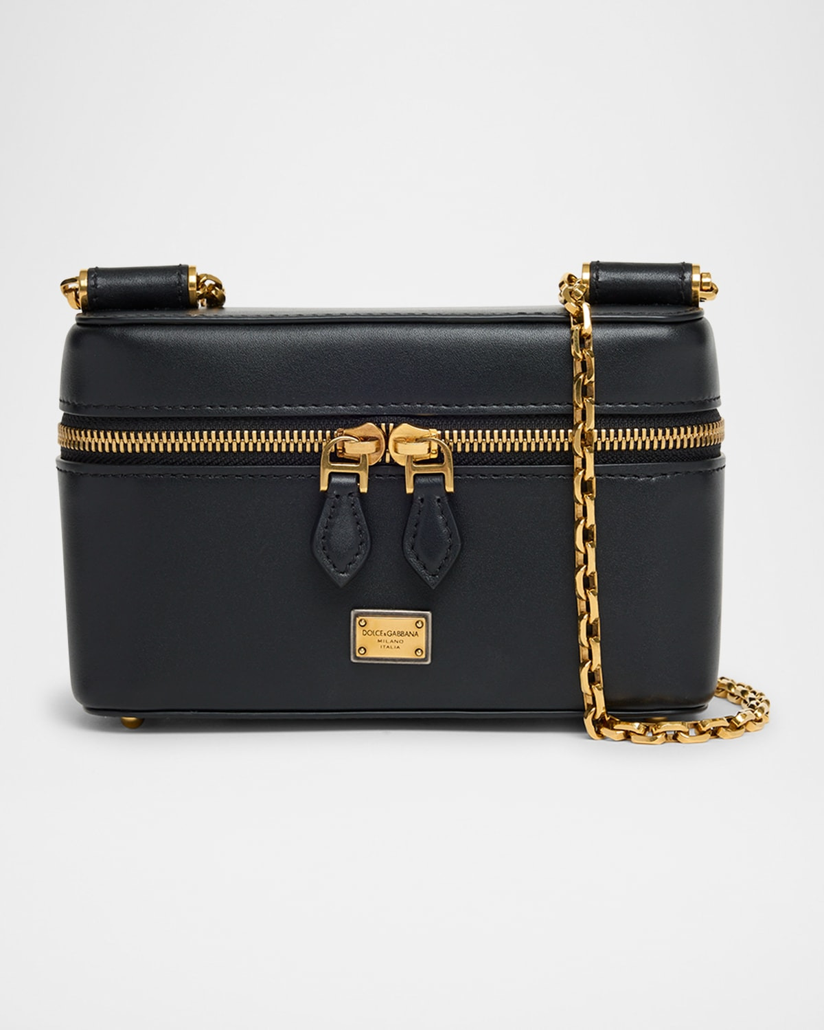 - Dolce&Gabbana "Sicily" vanity crossbody bag in calfskin leather and polyester - Sliding chain crossbody strap - Two-way zip top closure - Interior, attached mirror - Feet protect bottom of bag - Golden hardware - Approx. 4"H x 7"W x 3"D - Made in Italy
