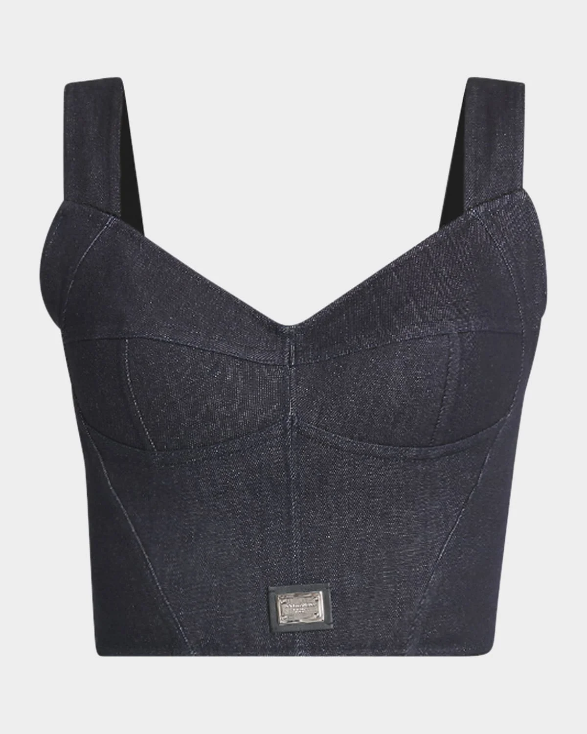 Dolceamp;Gabbana denim top featuring corsetry construction and a silvertone logo plaque hem Sweetheart neckline Sleeveless Fitted Cropped length Back zip Cotton/nylon/polyamide/spandex Made in Italy
