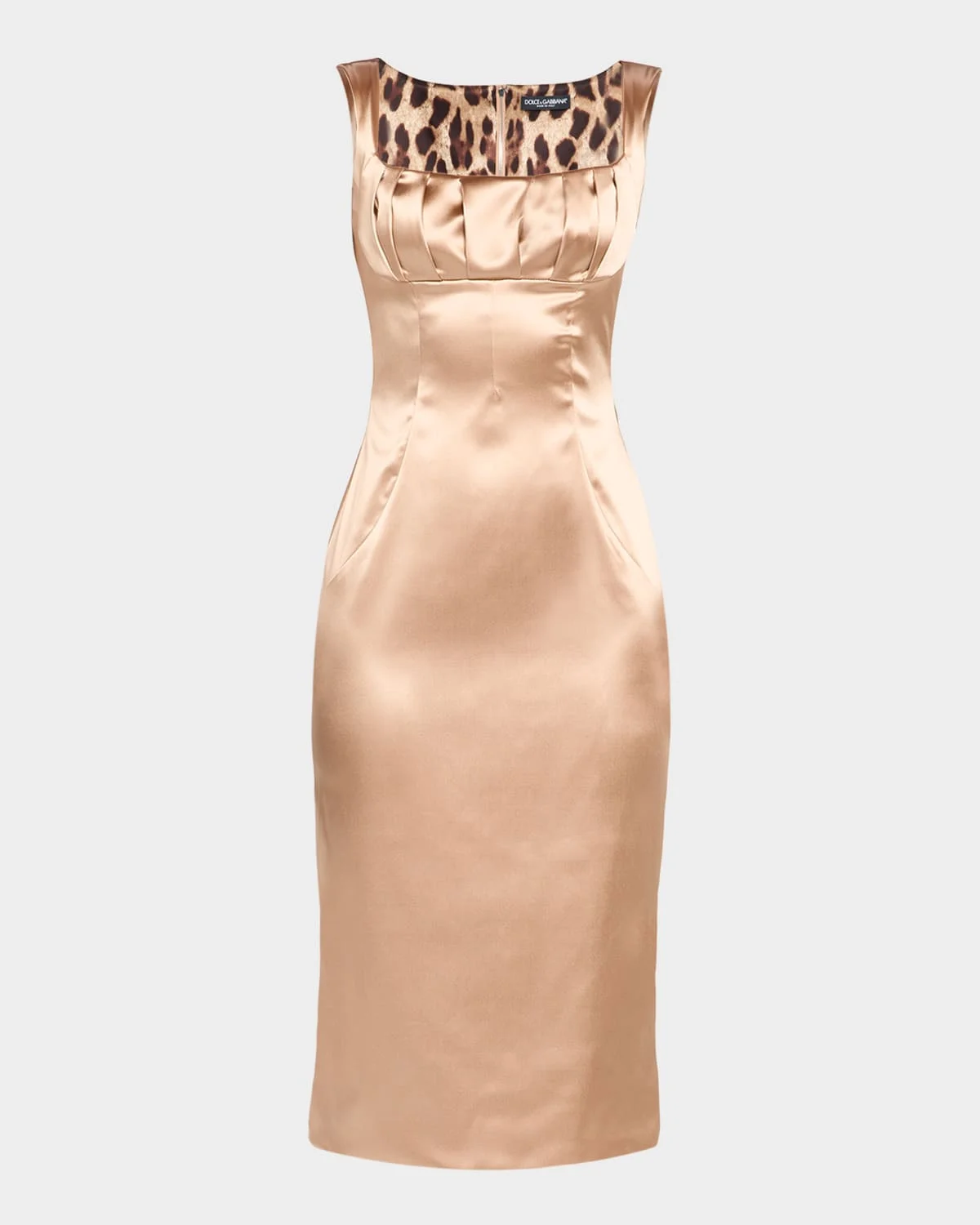 - Dolce&Gabbana stretch satin dress featuring a pleated bust - Square neckline - Sleeveless - Sheath silhouette - Hem falls below the knee - Walking vent back - Back zip - Acetate/nylon/polyamide/spandex - Made in Italy