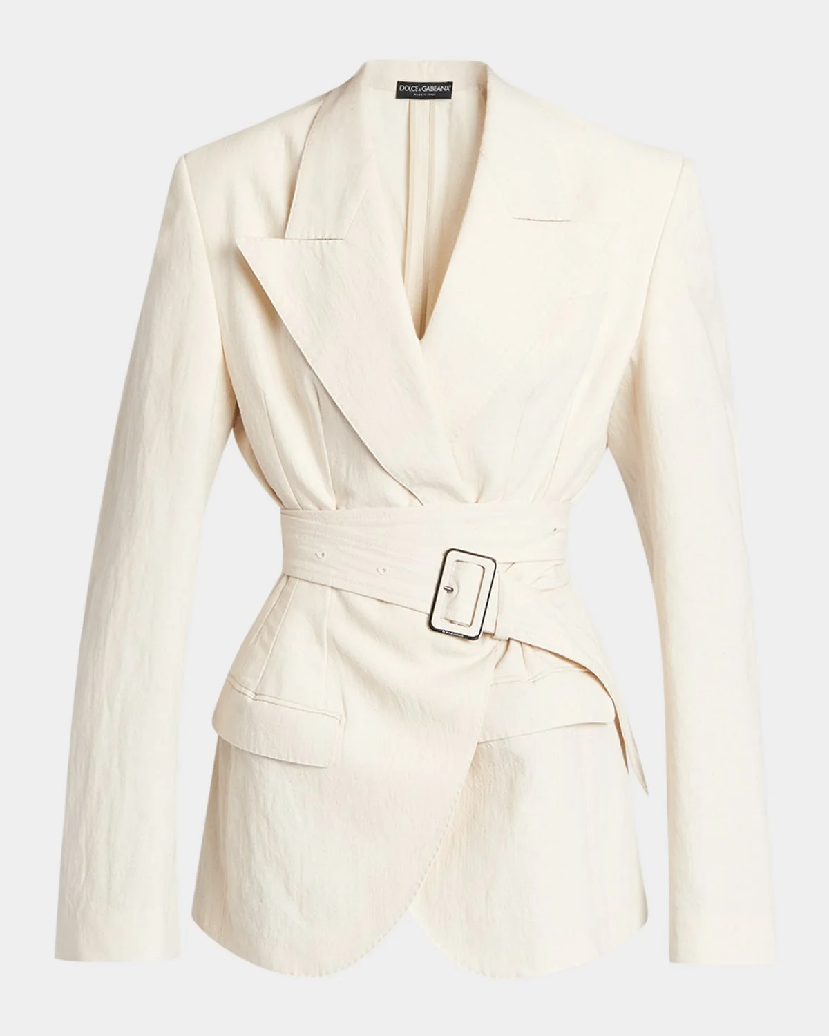A standout piece that captures the essence of power dressing, this oversized Dolce & amp;Gabbana blazer is defined by a menswear-inspired silhouette with dramatic sculpted shoulders, an adjustable tonal belt to cinch the waist, effortlessly balancing volume with a sharp, structural frame. Peak lapels Long sleeves; button cuffs Padded shoulders Side flap pockets Slim fit Hem falls below the hip Walking vent back Adjustable belt closure Cotton/linen Lining: Acetate/silk Dry clean Made in Italy SIZE & FITModel measurements: 5 & apos;10" tallModel is wearing a US size 4/Small