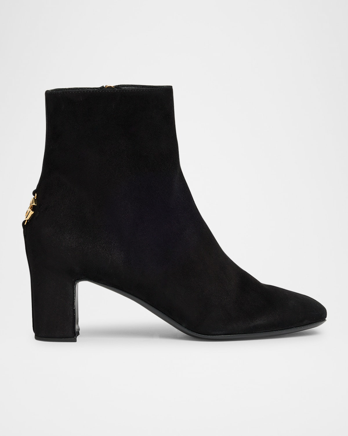 - Dolce&Gabbana soft suede ankle booties featuring a golden logo medallion at the backstay - 2.36 in / 60 mm covered block heel - Round toe - Zip closure for easy on/off - Leather outsole - Professional cleaning recommended, spot clean - Made in Italy