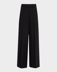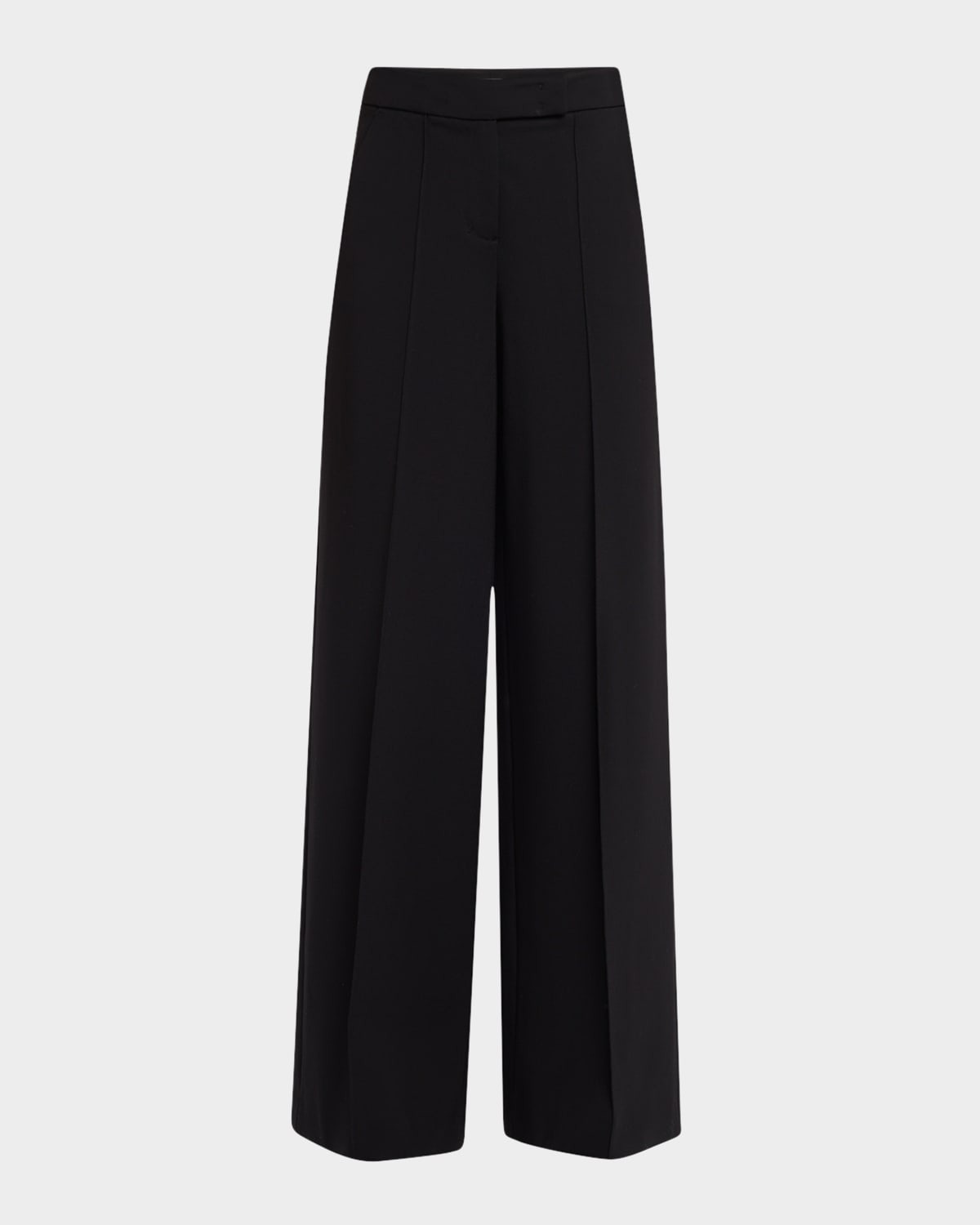 - DOROTHEE SCHUMACHER "Emotional Essence" pants elevated with front pintucks - Approx. measurements: - 35.5" inseam; 45.5" outseam - High-rise sits high on the hips - Flat front - Full length - Wide legs - Extended tab/zip fly - Viscose/nylon/polyamide/elastane - Unlined - Machine wash, line dry - Imported