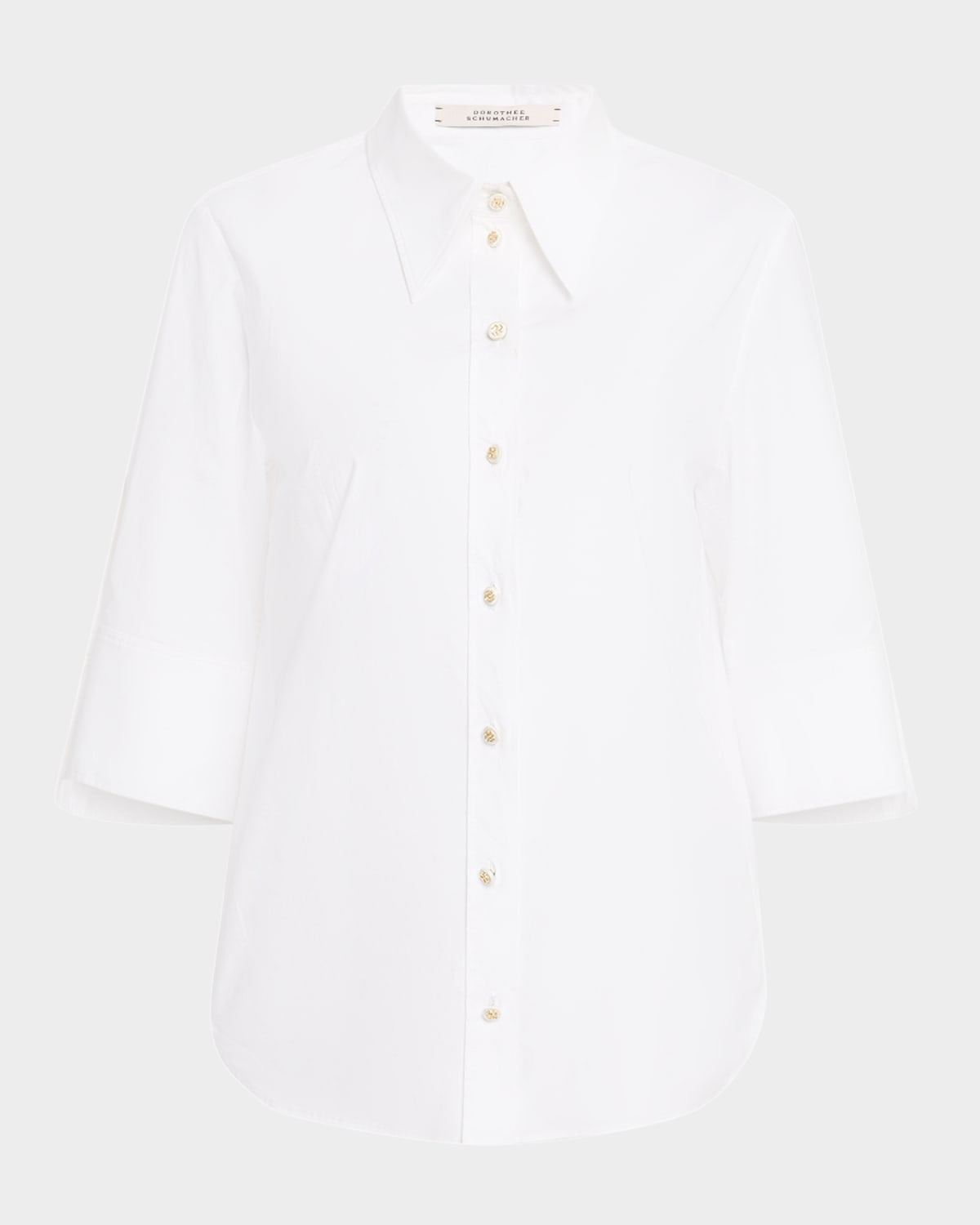 - DOROTHEE SCHUMACHER "Pure Power" blouse in crisp cotton poplin, adorned with flower-embellished buttons - Approx. 25"L from shoulders to hem - Point collar; button front - Elbow sleeves - Split, single-button cuffs - Box-pleated back yoke - Rounded hem - Relaxed fit - Cotton/elastane - Unlined - Machine wash warm, dry flat - Imported