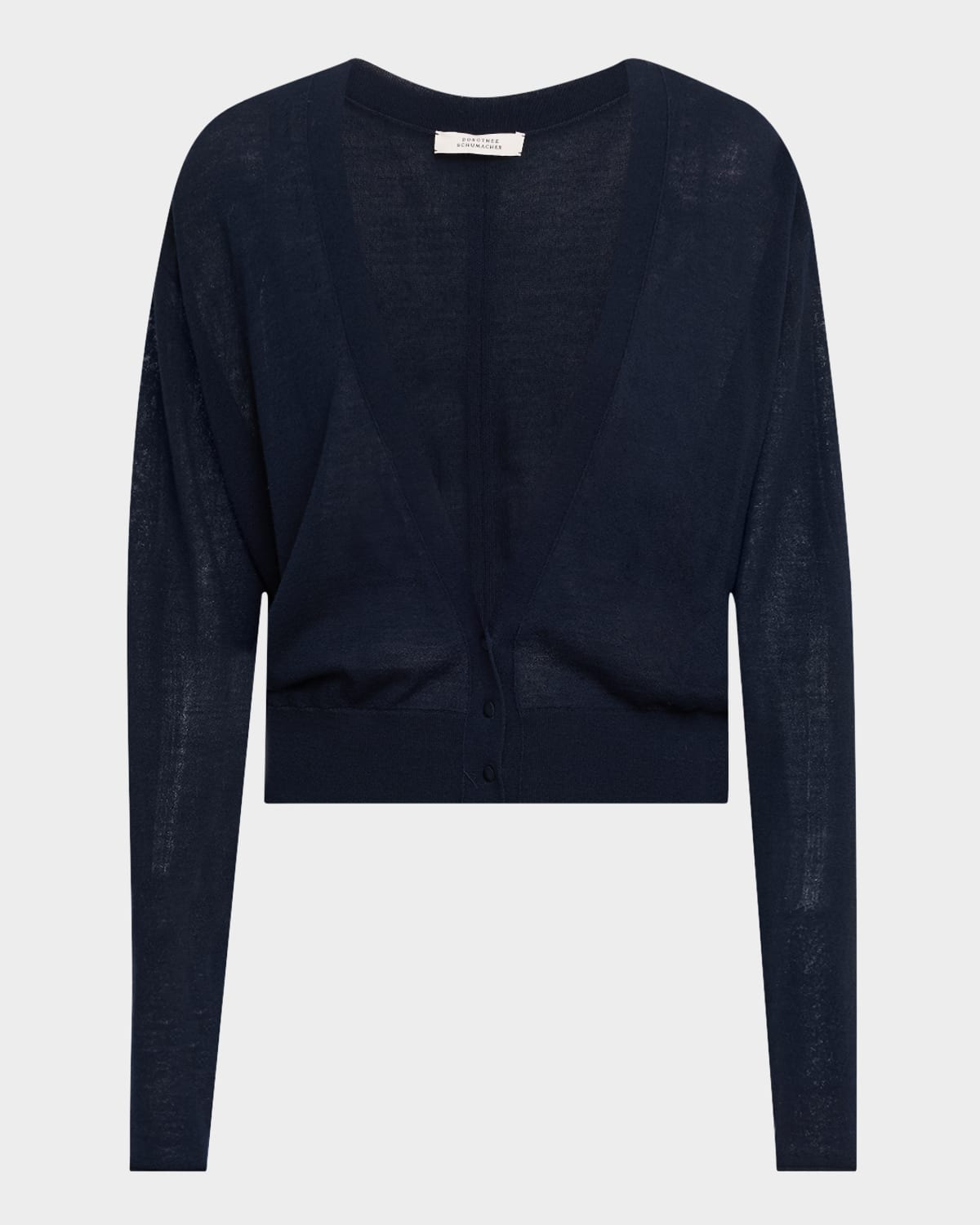 - DOROTHEE SCHUMACHER "Refined Essentials I" lightweight knit cardigan - Approx. 21.5"L from shoulders to hem - Deep V neckline; button front - Long sleeves; approx. 23"L - Relaxed fit - Merino wool/cotton - Unlined - Machine wash cold - Trim: Satin - Imported