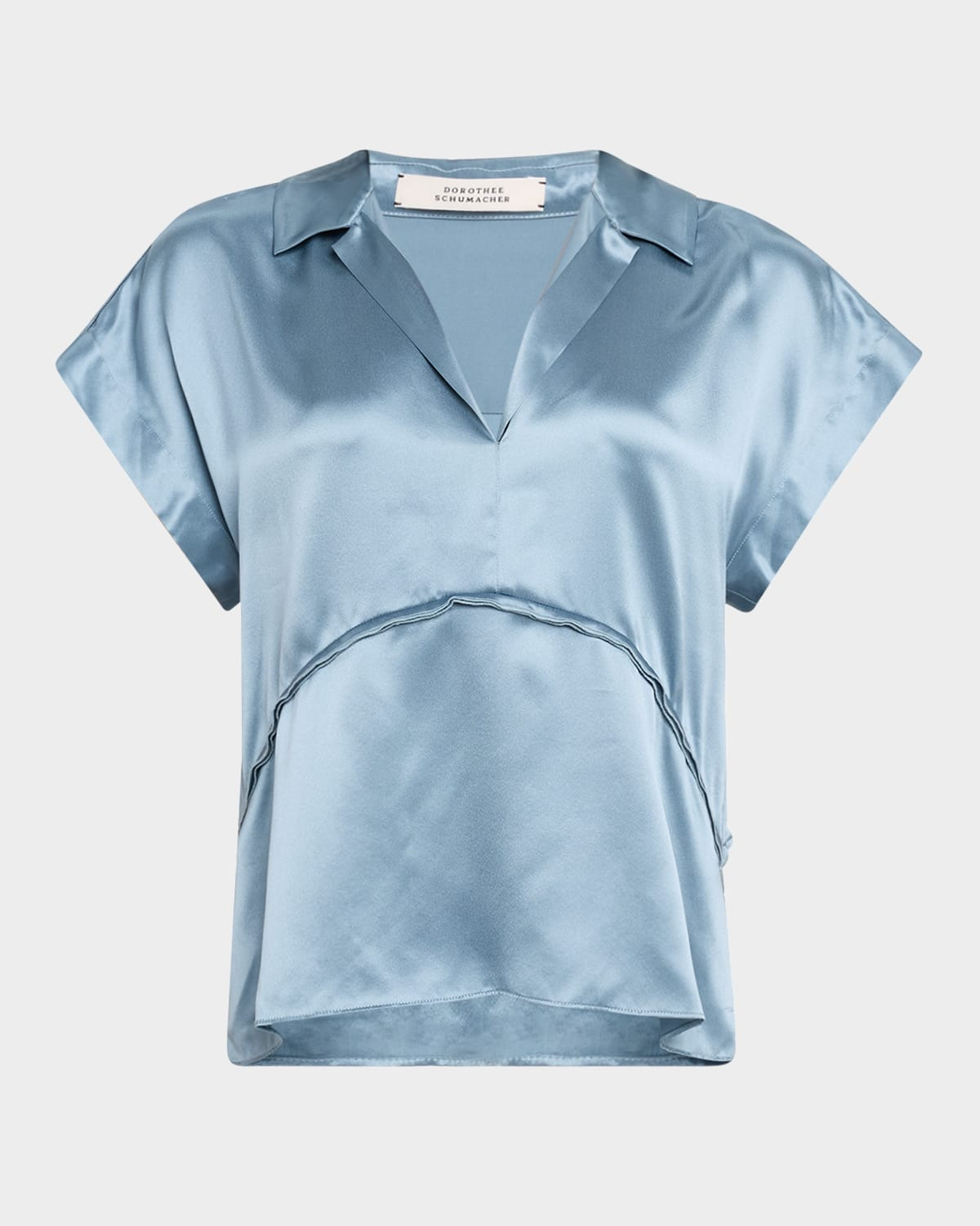 - DOROTHEE SCHUMACHER "Sense Of Shine" top crafted in shiny silk satin and detailed with an exposed seam - Approx. 24.5"L from shoulders to hem - Notched lapels - Short sleeves; approx. 4"L - Back yoke - Hem side slits - Relaxed fit - Pullover style - Silk - Unlined - Machine wash cold - Imported