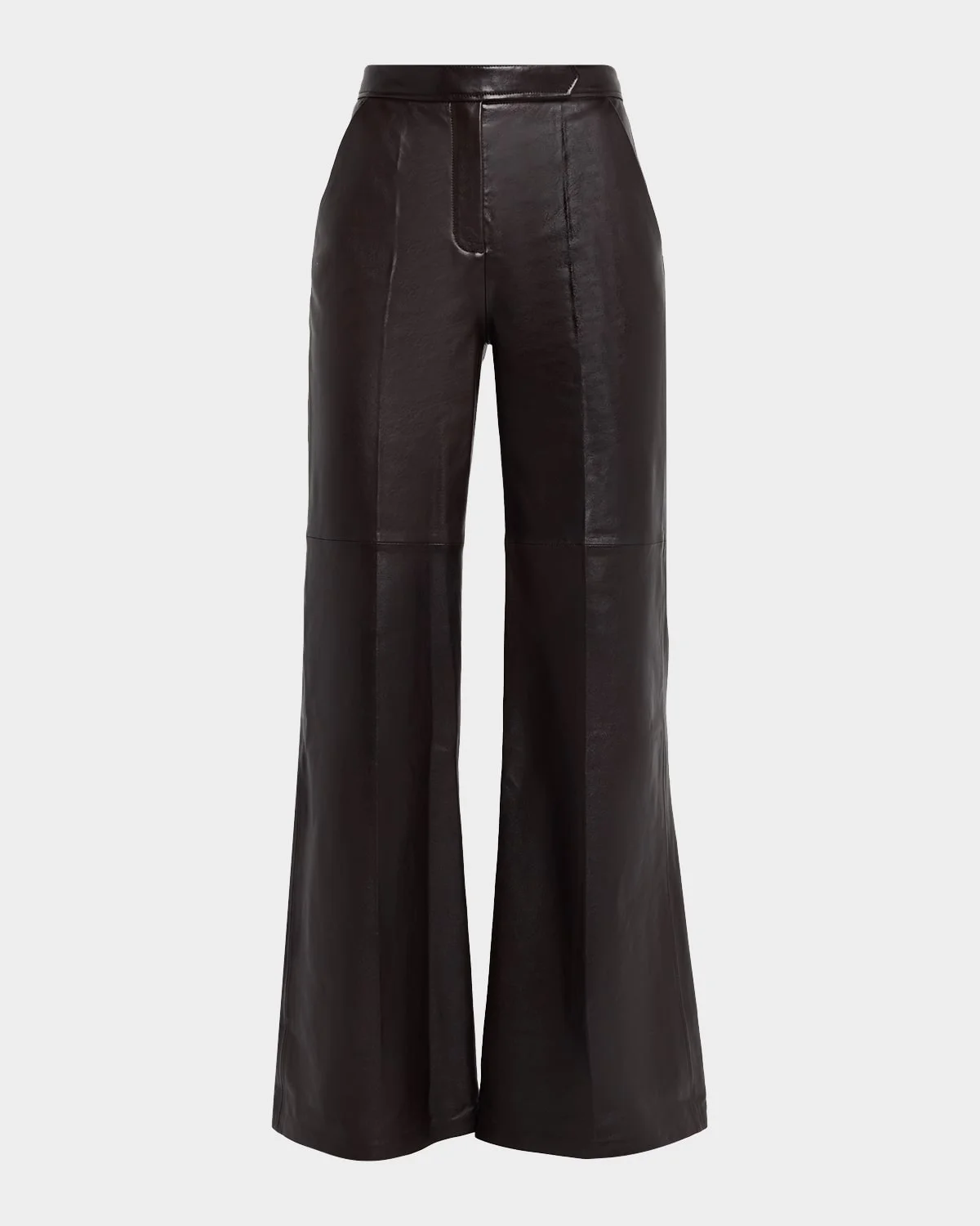 These "Sleek Statement" pants from DOROTHEE SCHUMACHER are cut from soft lambskin leather with pressed pleats for crisp structure Midrise sits high on the hips Flat front Side slant pockets Back welt pockets Full length Flared legs Extended tab/zip fly Leather Dry clean Imported