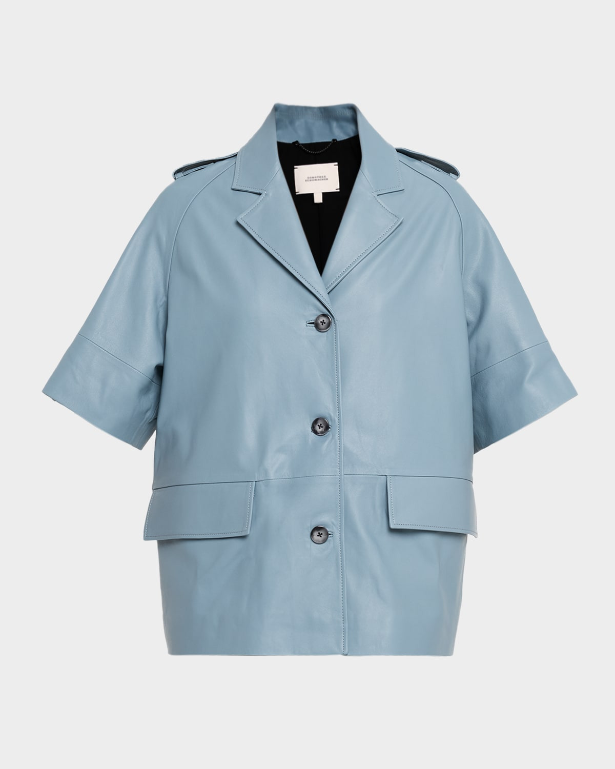 - A remix of the favorite trench coat, the "Sleek Statement I" coat from DOROTHEE SCHUMACHER is crafted in soft lambskin leather, complete with a matching waist self-tie - Approx. 27.5"L from shoulders to hem - Notched lapels; button front - Shoulder epaulettes - Elbow raglan sleeves; approx. 18.5"L - Button-through cuff tabs - Front flap pockets - Boxy fit - Leather - Lining: Cotton/polyester - Do not iron - Imported