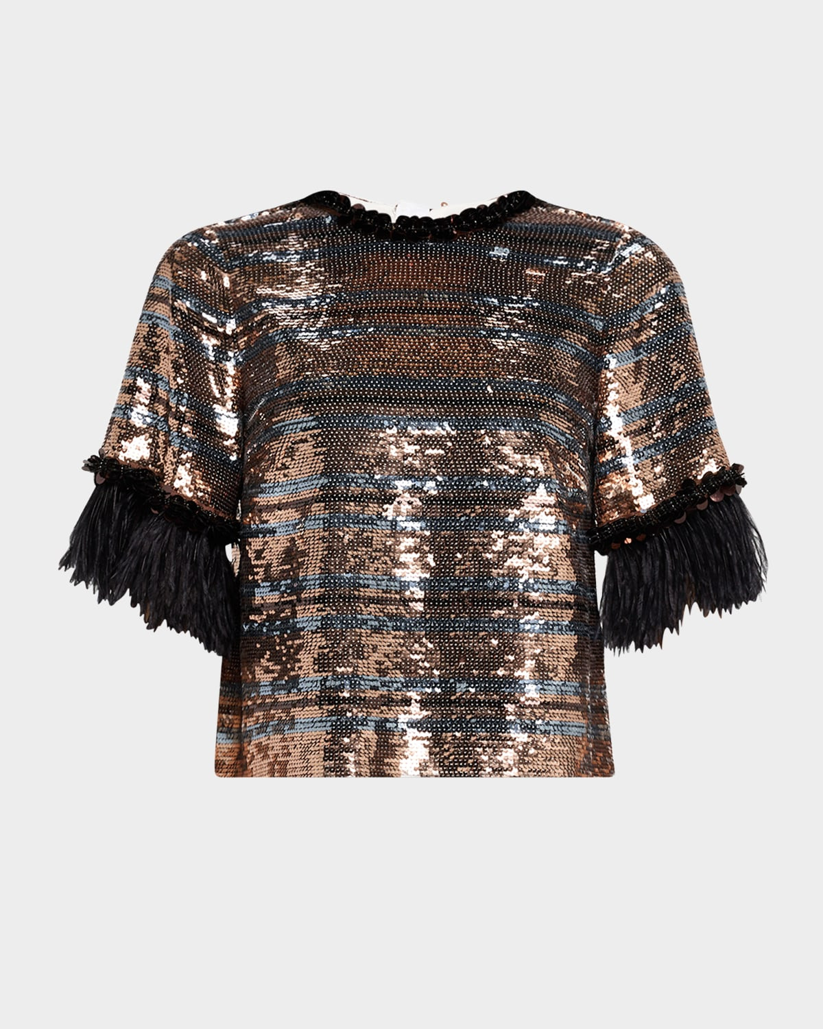 - DOROTHEE SCHUMACHER "Sparkling Shine" sequin blouse with stripes, embellished with paillette trim and ostrich feather cuffs - Approx. 20"L from shoulders to hem - Crew neckline - Short sleeves; approx. 9"L - Cropped style - Boxy fit - Back zipper - Cotton - Lining: Cotton - Dry clean - Trim: Feather - Imported