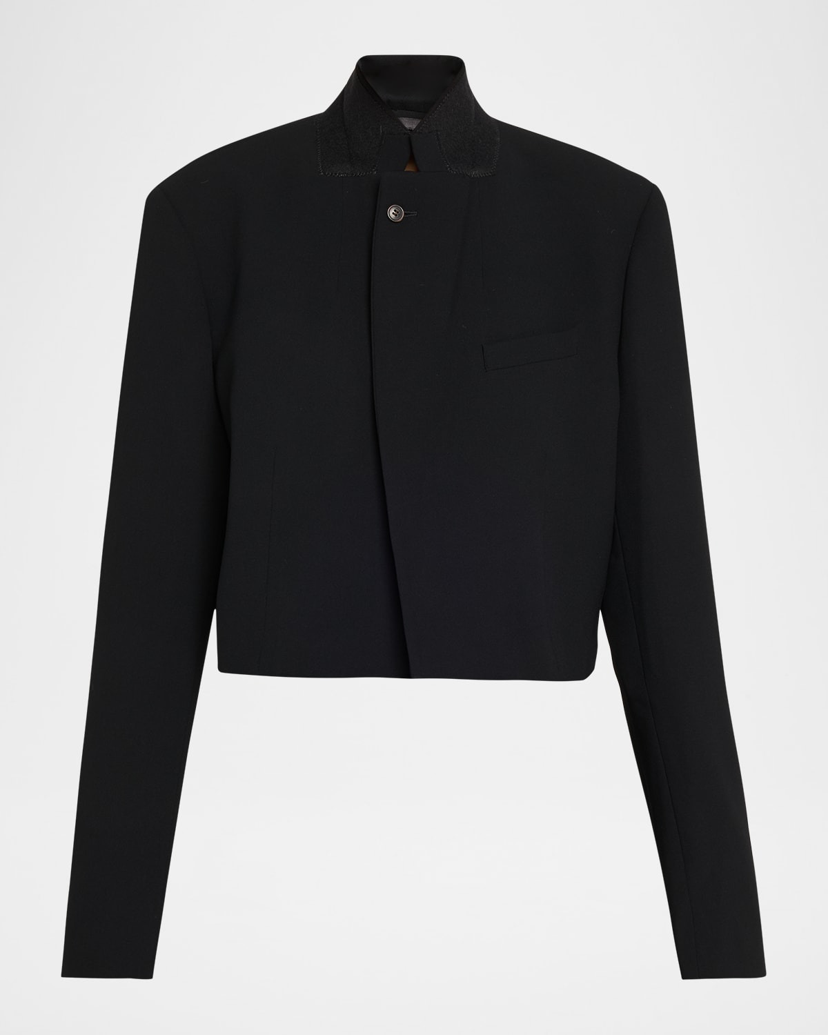 Dries Van Noten "Baftan" jacket tailored in polyester Notch lapels; open front Long sleeves; button cuffs Padded shoulders Oversized fit Cropped length Polyester Made in Morocco