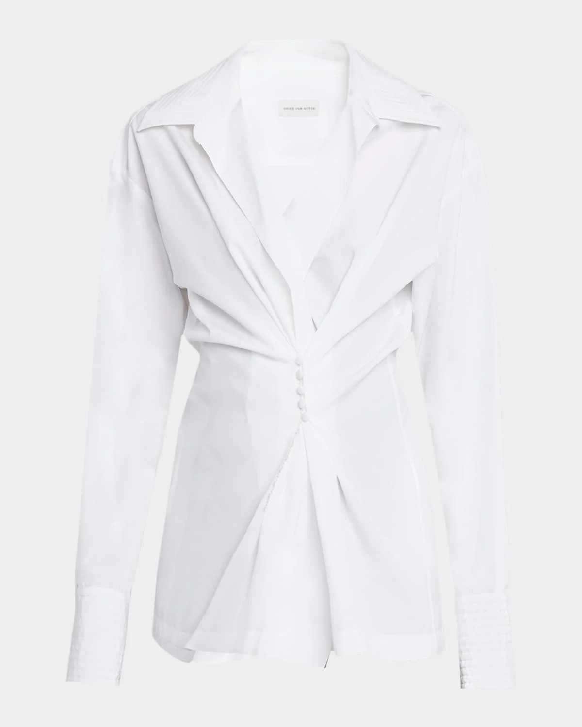 Dries Van Noten "Clickys" shirt is crafted from crisp cotton poplin gathered at the waist with pleats and features topstitching along the collar and cuffs Spread collar; button front Long sleeves; button cuffs Slim fit Hem falls below the hip Cotton Made in Poland