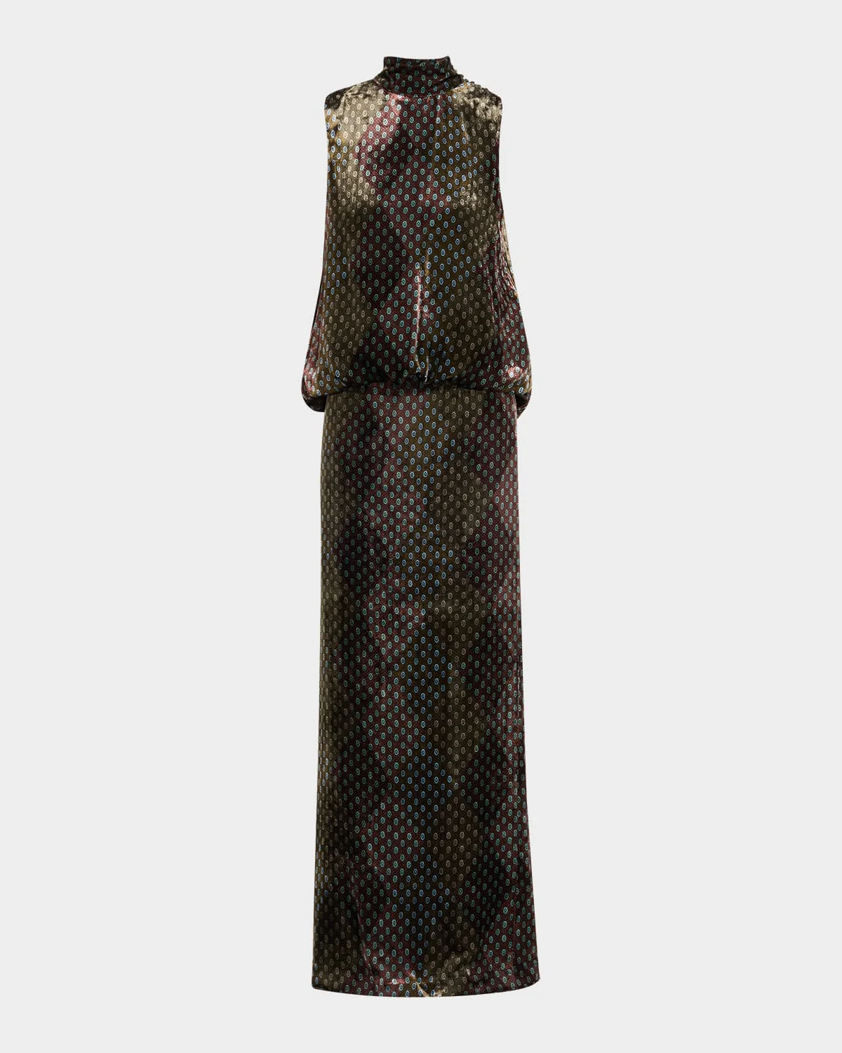 Dries Van Noten "Debo" printed velvet dress elevated with a draped open back Mock neckline Sleeveless Drop waist Column silhouette Full length Invisible side zip Viscose/silk Dry clean Imported