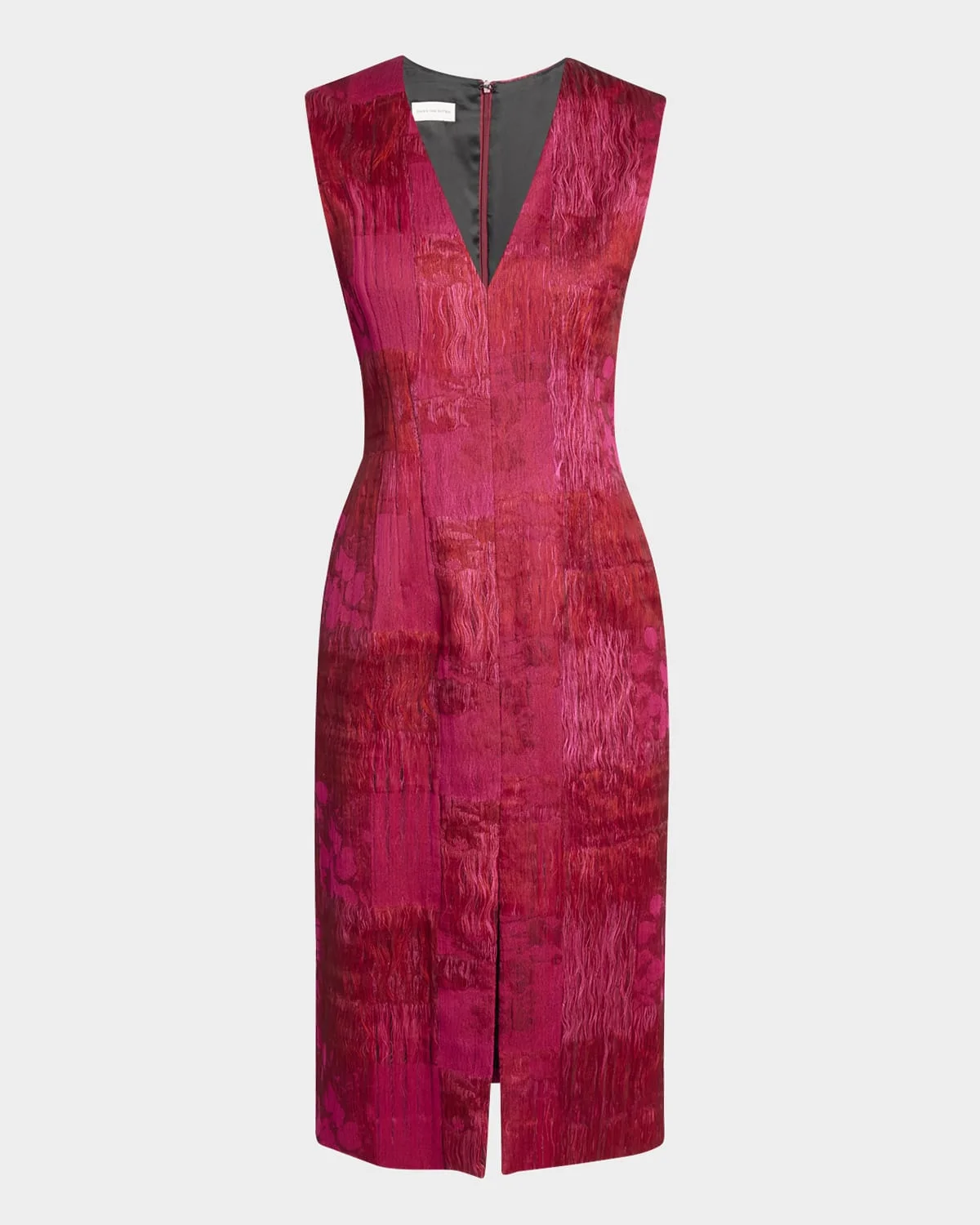 - Dries Van Noten "Delina" patchwork dress with a crinkle-effect - V neckline - Sleeveless - Hem hits around the knee - Sheath silhouette - Front walking vent - Back zip - Cotton/acetate/polyester - Made in Poland