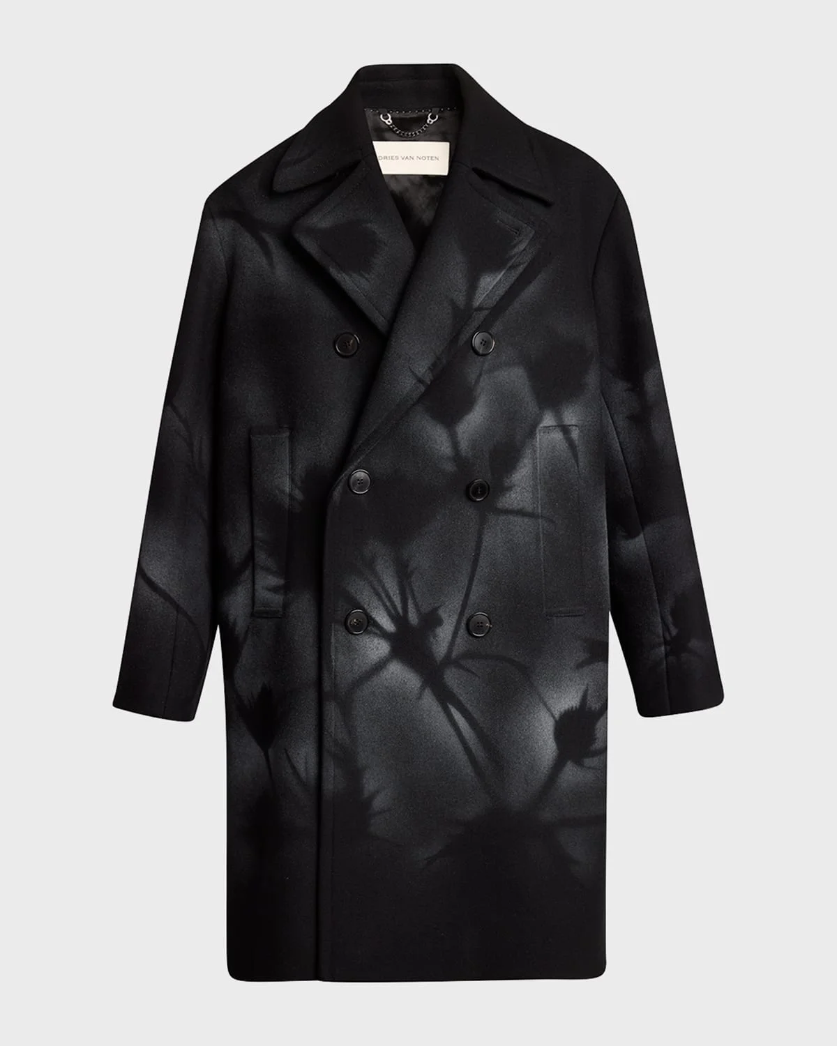 - Dries Van Noten "Racos" woolen coat features a moody abstract pattern with a botanical motif - Notched lapels - Long sleeves - Two front welt pockets - Full length - Oversized fit - Double-breasted closure - Wool/nylon/polyamide - Made in Poland