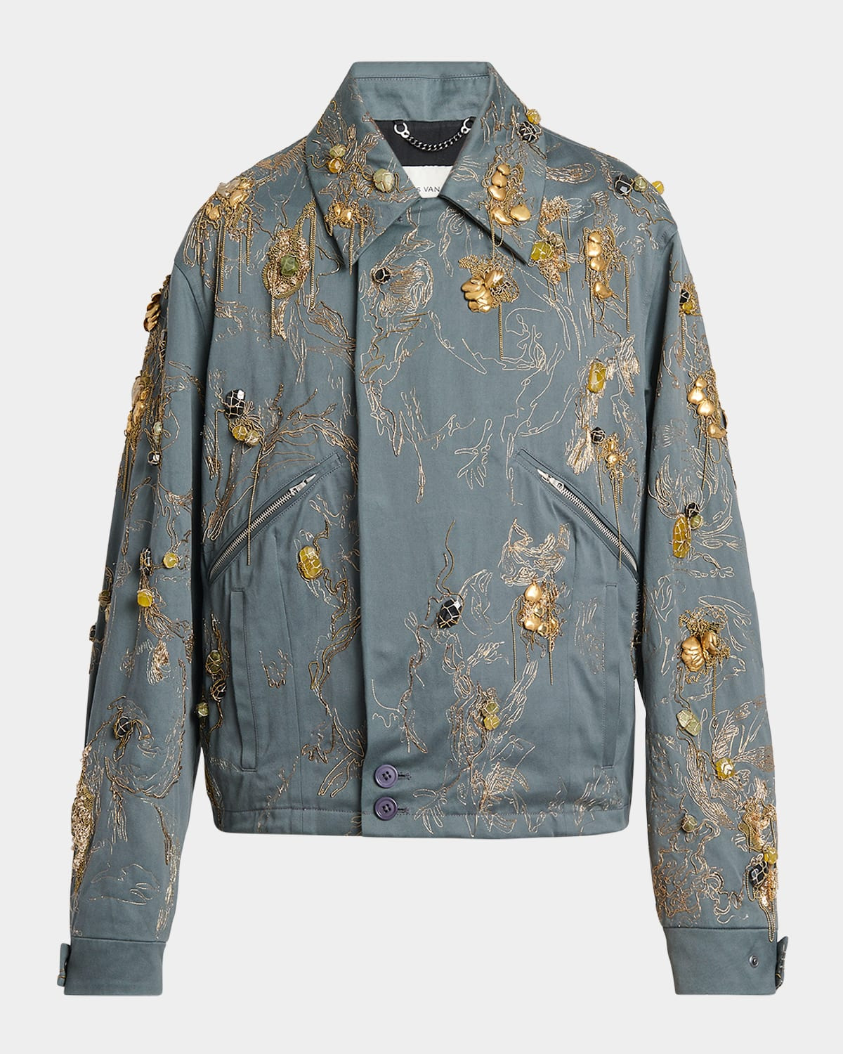 - Dries Van Noten "Velen" jacket featuring metallic embroideries and gemstone embellishements - Point collar - Asymmetric button closure - Front zip pockets and welt pockets - Relaxed fit - Adjustable snap cuffs - Cotton - Lining: Cotton/viscose - Imported