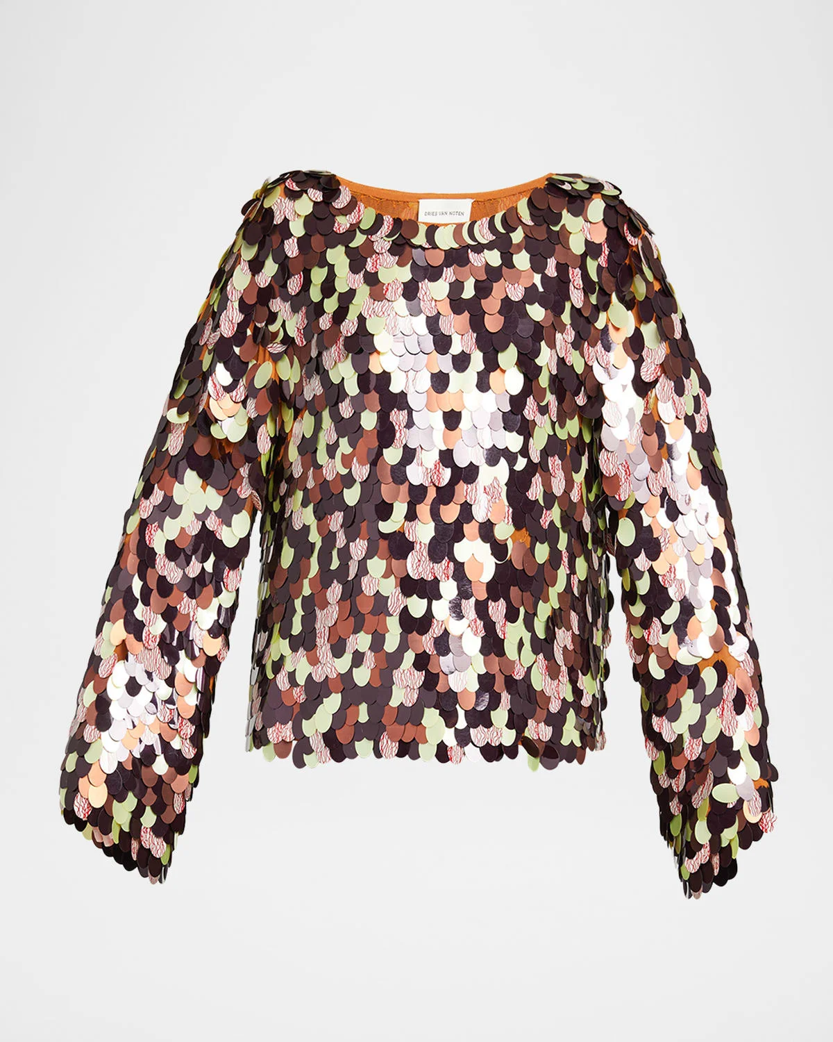 Multicolor paillette top by Dries Van Noten. Wide neckline Long sleeves Relaxed fit Hem falls to the hip Pullover style Viscose Dry clean Imported