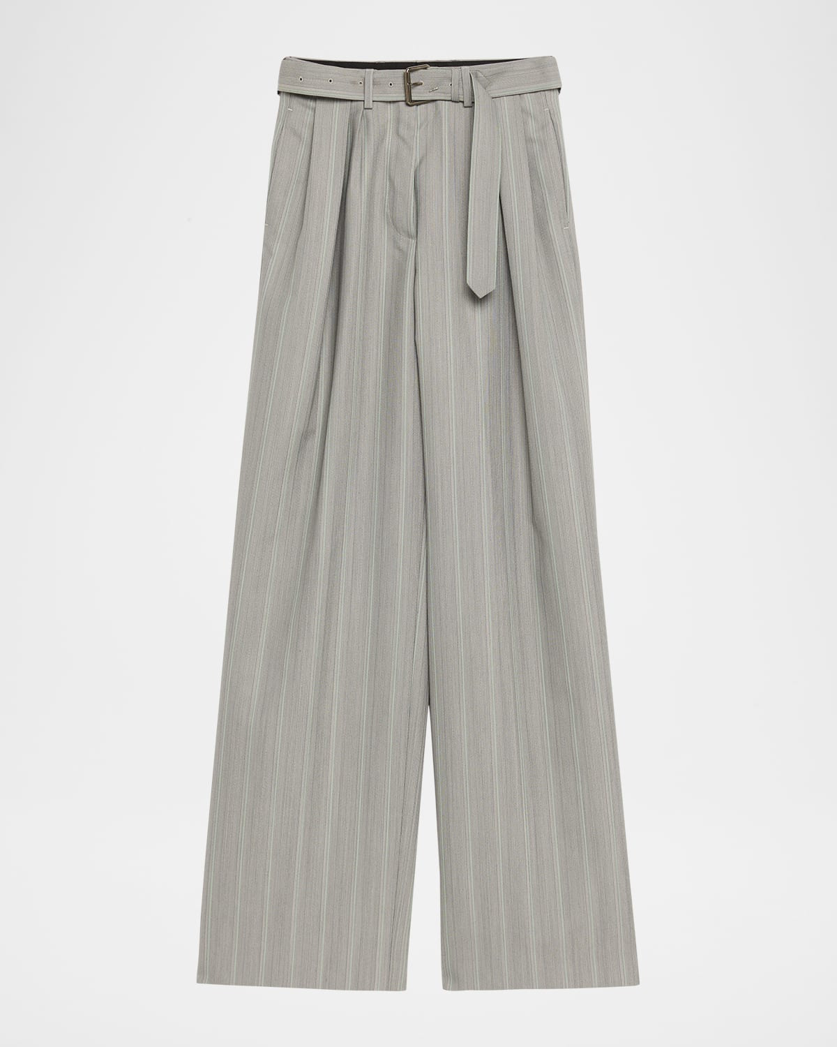 Dries Van Noten "Peaches" pinstripe pants crafted in a luxurious blend of wool and silk adorned with a self belt High rise Pleated front Side slip pockets Back welt pockets Wide legs Full length Button/zip fly; belt loops Wool/polyester/silk Dry clean Imported
