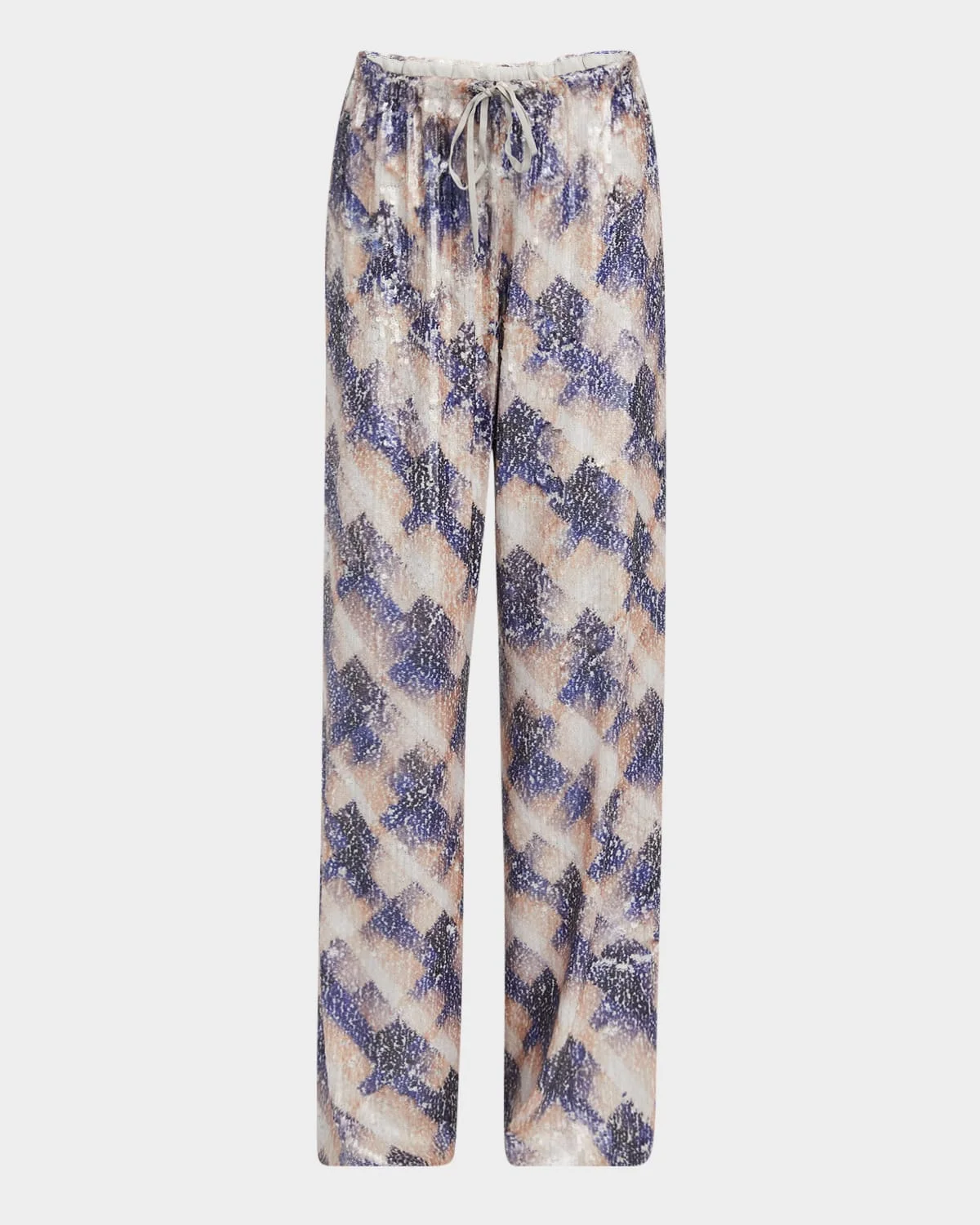 Showcasing a sequinembellished geometric plaid design, the "Puvis" pants by Dries Van Noten offer a statementmaking update to a classic, relaxed pant silhouette Midrise drawstring waistband Full length Straight legs Pullon style Viscose Imported