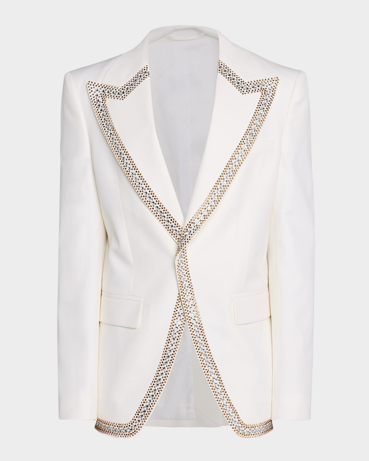 - Dsquared2 blazer crafted from a luxe cotton-silk blend, defined by peak lapels with edgy metal studs for a modern evening glamour finish - Single-breasted front - Chest welt pocket - Peak lapels - Hip flap pockets - Four-button cuffs - Single-vented back - Cotton/silk - Lining: Cotton/polyester/viscose - Dry clean - Made in Italy