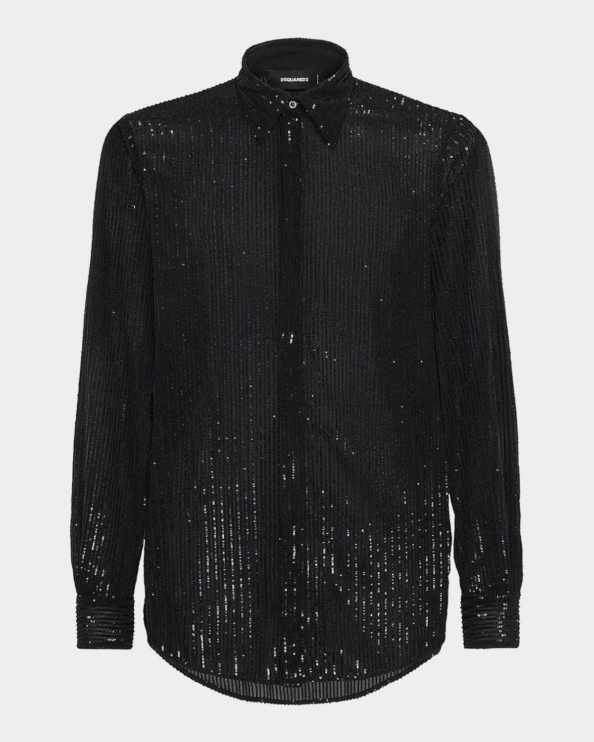 Glistening sequin pinstripes illuminate this sheer Dsquared2 shirt for a modern take on blacktie glamour Point collar Concealed button placket Long sleeves Buttoned cuffs Rounded hem Classic fit Polyester Dry clean Made in Italy