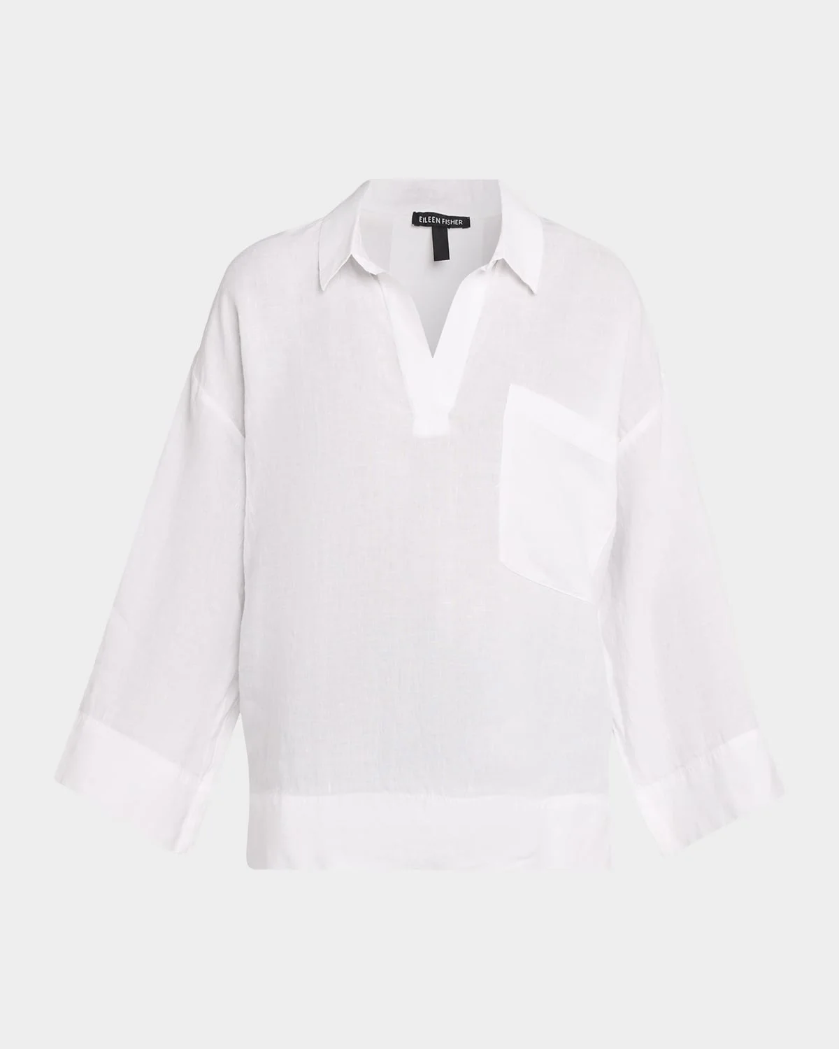 The breezy shirt from Eileen Fisher is crafted of light and airy organic linen, designed with a generous boxy fit that drapes away from the body Approx. 25"L from shoulder to hem V neckline with spread collar Drop shoulders Long sleeves Chest patch pocket Back inverted pleat Hem side slits Boxy fit Organic linen Machine wash cold Imported SIZE & FITModel measurements: 5 & apos;10" tallModel is wearing a US size 4/Small