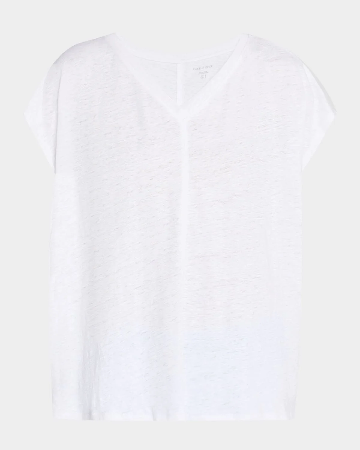 Eileen Fisher tee in breezy, naturally textured organic linen Approx. 24"L from shoulders to hem V neckline Short sleeves Boxy fit Pullover style Organic linen Machine wash cold Imported