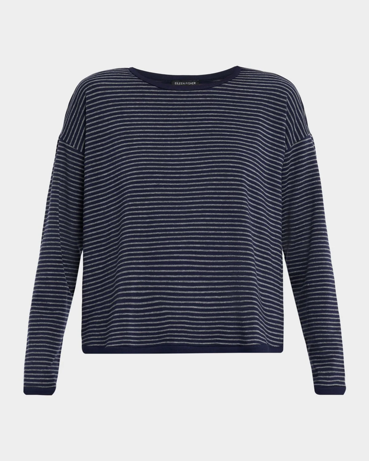 This Eileen Fisher top is crafted in striped terry with a soft, brushed fleecy interior Approx. 23"L from shoulders to hem Crew neckline Drop shoulders Long sleeves Relaxed fit Pullover style Tencel™ lyocell/organic cotton/elastane Machine wash cold Made in the USA
