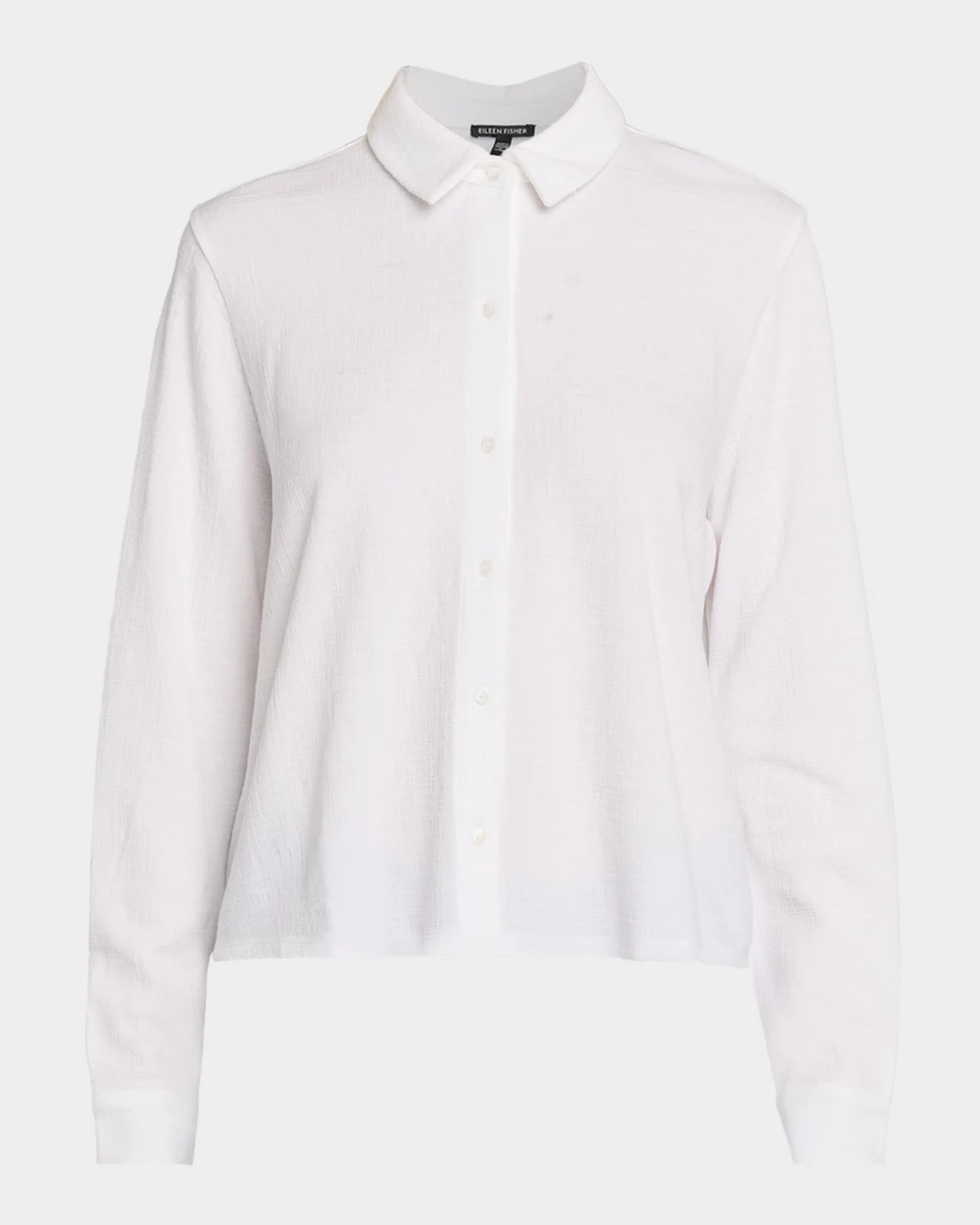This Eileen Fisher shirt is cut from fluid fabric with a rich textural handfeel Point collar; button-down front Long sleeves; button cuffs Box-pleated back yoke Straight hem Relaxed fit Tencel™ lyocell/elastane Machine wash cold Imported SIZE & FITModel measurements: 5 & apos;10" tallModel is wearing a US size 4/Small
