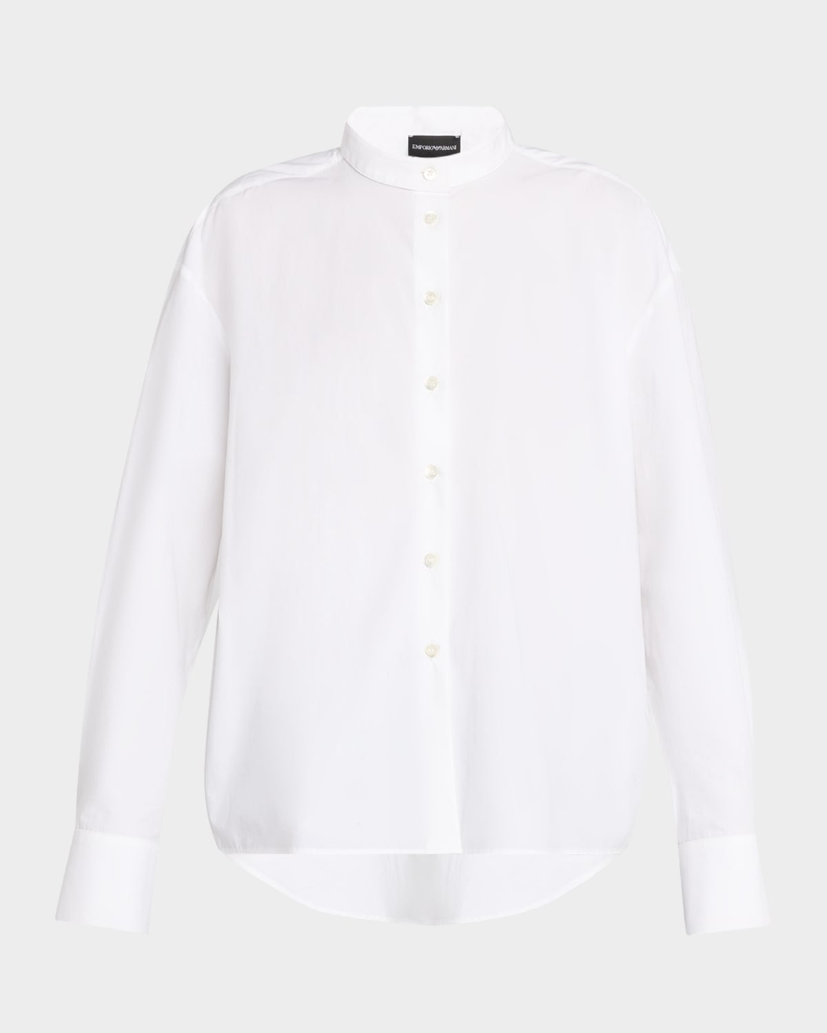 - Emporio Armani shirt in cotton poplin features a layered back for a modern touch - Band collar; button front - Drop shoulders - Long sleeves - Button cuffs - Pleated back yoke - High-low hem - Relaxed fit - Cotton - Dry clean - Imported