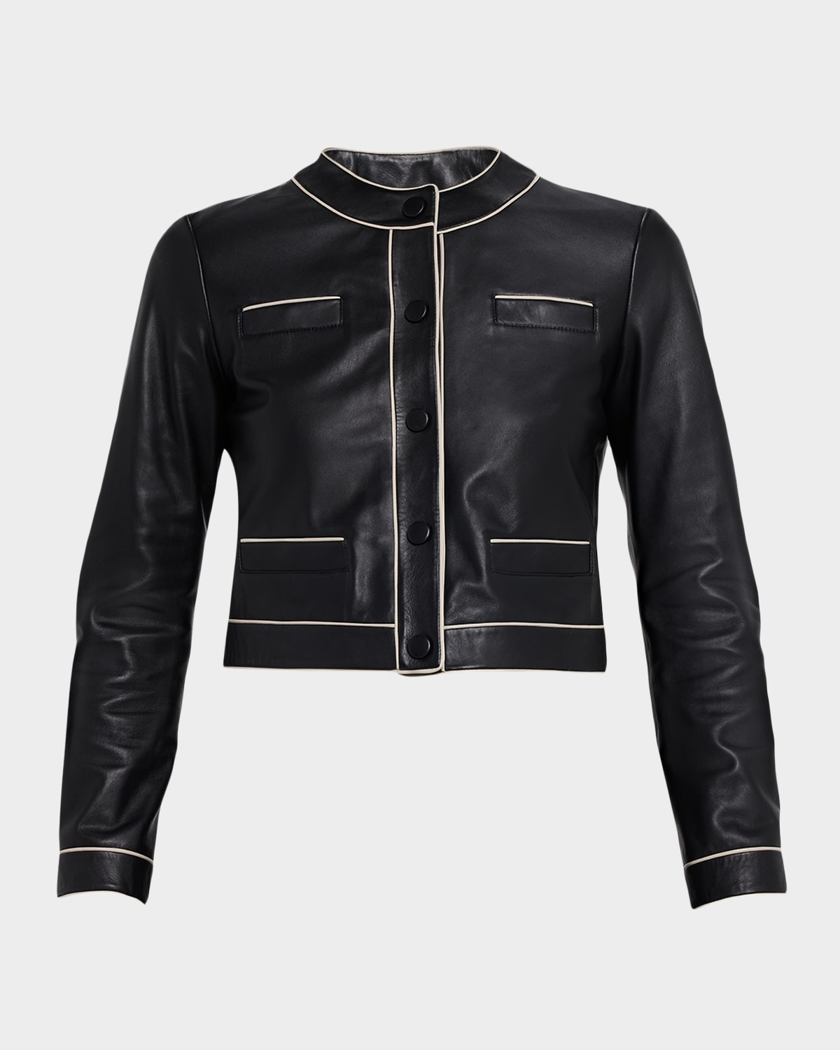 - Emporio Armani soft leather jacket elevated with contrast leather piping - Crew neckline; snap front - Bracelet sleeves - Front welt pockets - Cropped style - Relaxed fit - Leather - Lining: Polyester/elastane - Dry clean - Imported