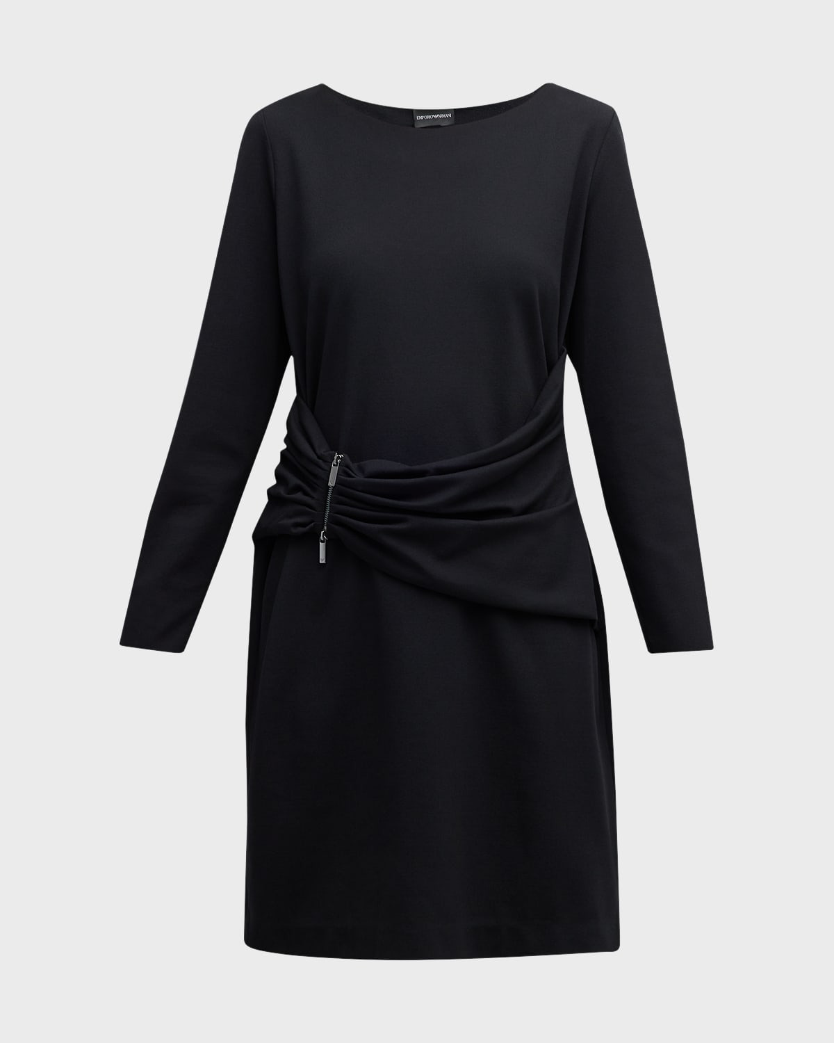 Emporio Armani jersey midi dress features a zipembellished sash along the waist Bateau neckline Long sleeves Hem falls above the knee Aline silhouette Invisible side zipper Viscose/polyamide/elastane Lining: Polyester Dry clean Made in Romania Size Note: Item runs small, consider ordering a size up. Model height: 5'10"/177cm.