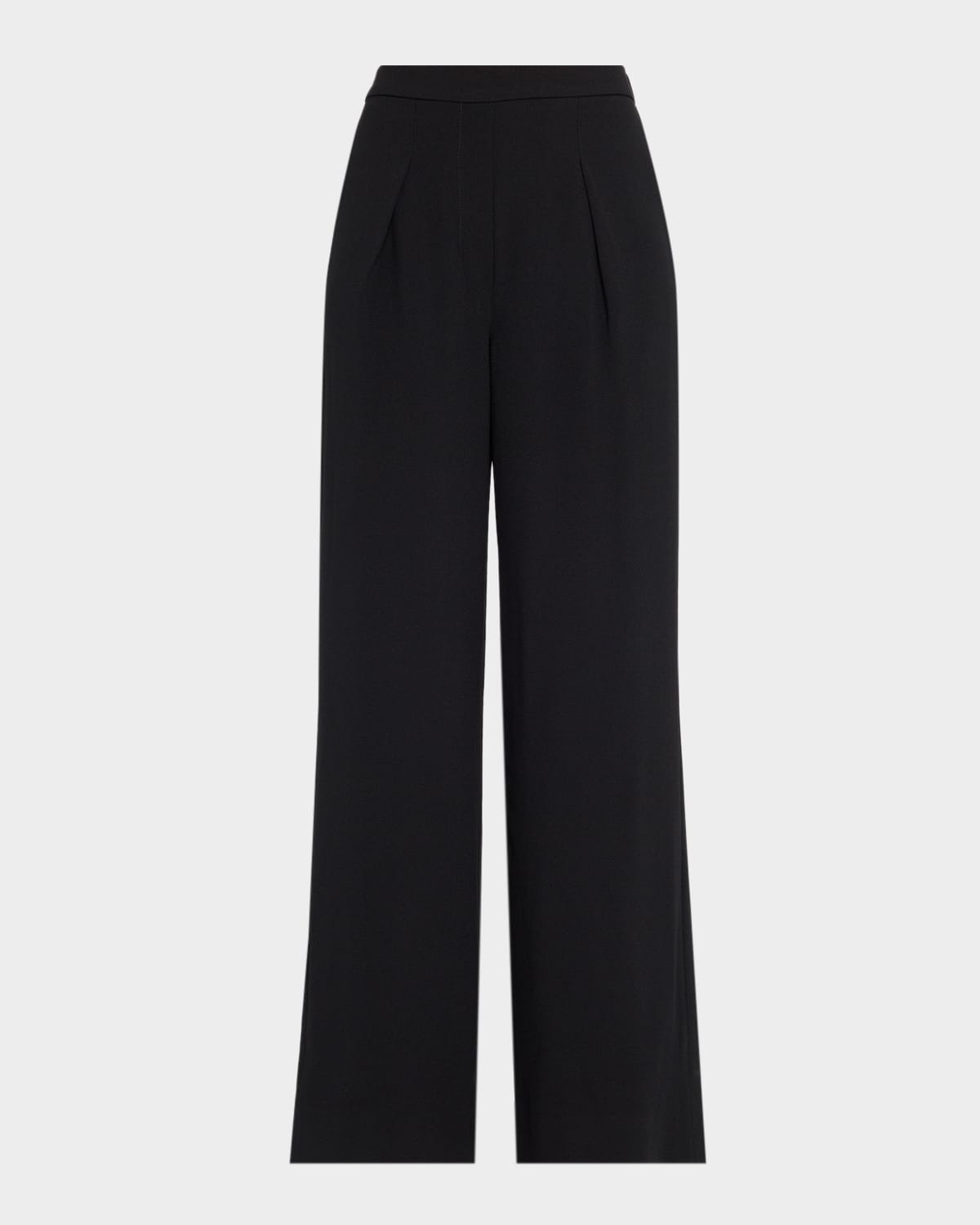 - These loose-stretch Emporio Armani trousers are finished with subtle front pleats for an added sophisticated touch - High-rise sits high on the hips - Partially elasticized waistband - Pleated front - On-seam pockets - Full length - Relaxed, straight legs - Pull-on style - Polyester/elastane - Dry clean - Imported